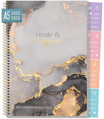 Boah, dieser Häfft-Timer ist ja mal was Besonderes! Nicht nur ein normaler Kalender, sondern dein persönlicher Begleiter für Schule, Ausbildung oder Uni. Läuft von August 2025 bis September 2026 - also perfekt fürs Schuljahr! Mit wunderschönen Aquarell-Illustrationen und diesem edlen Blattgold-Look. Besonders cool: Habit- und Mood-Tracker helfen dir, gute Gewohnheiten zu entwickeln und auf dich selbst zu achten. Da sind auch coole Extras dabei wie eine Bucketlist, Sudoku-Spiele, dotted Notizseiten für alle Einfälle und sogar ein Liebesbarometer! Aus FSC-zertifiziertem Papier, also nachhaltig und klimafreundlich. Mit Gummiband, Stiftschlaufe, Stickern und Einstecktasche - einfach praktisch! DIN A5 Format passt in jede Tasche, und die Spiralbindung macht das Umblättern super easy. Echt fancy und macht einfach Spaß!
