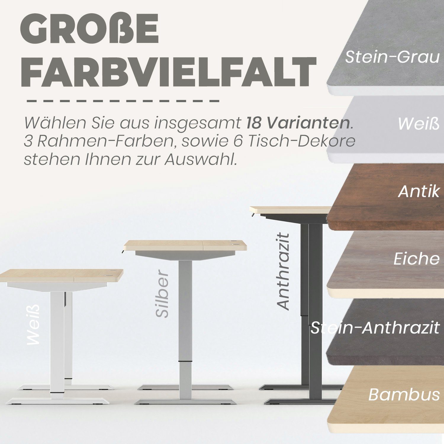 Also, wenn du mal sitzen, mal stehen willst beim Arbeiten, dann ist dieser VESKA Schreibtisch perfekt! Der geht elektrisch von 71 bis 120 cm hoch und runter - total easy. Mit dem Touchscreen kannst du dir sogar 4 Höhen merken, damit du nicht immer neu einstellen musst. Die Tischplatte ist richtig stabil (28 mm dick) und hält bis zu 120 kg aus. Kein Wackeln, dank der massiven Stahlbeine. Und praktisch: Kabeldurchführungen sind schon dabei, damit bei dir kein Kabelsalat entsteht. Es gibt 18 verschiedene Farbkombinationen zur Auswahl - da findest du sicher was für dein Büro oder Homeoffice. Egal ob du am Schreibtisch sitzt, stehst oder sogar auf'm Sportgerät arbeiten willst - mit dem bist du flexibel!