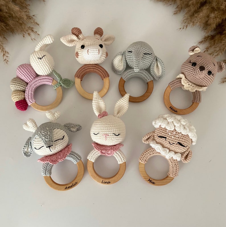 • Baby Rassel Beißring - Häkel Rassel Mit Holzring Für Babys