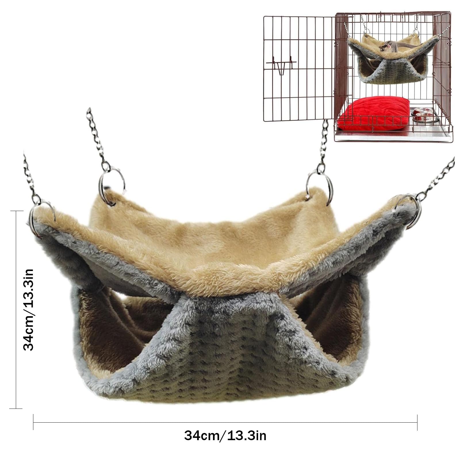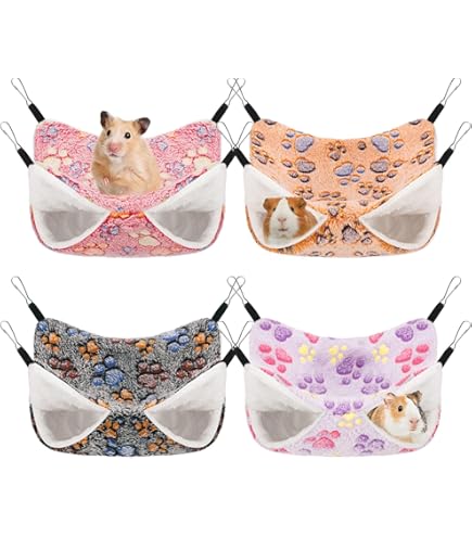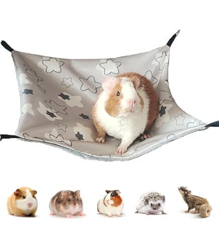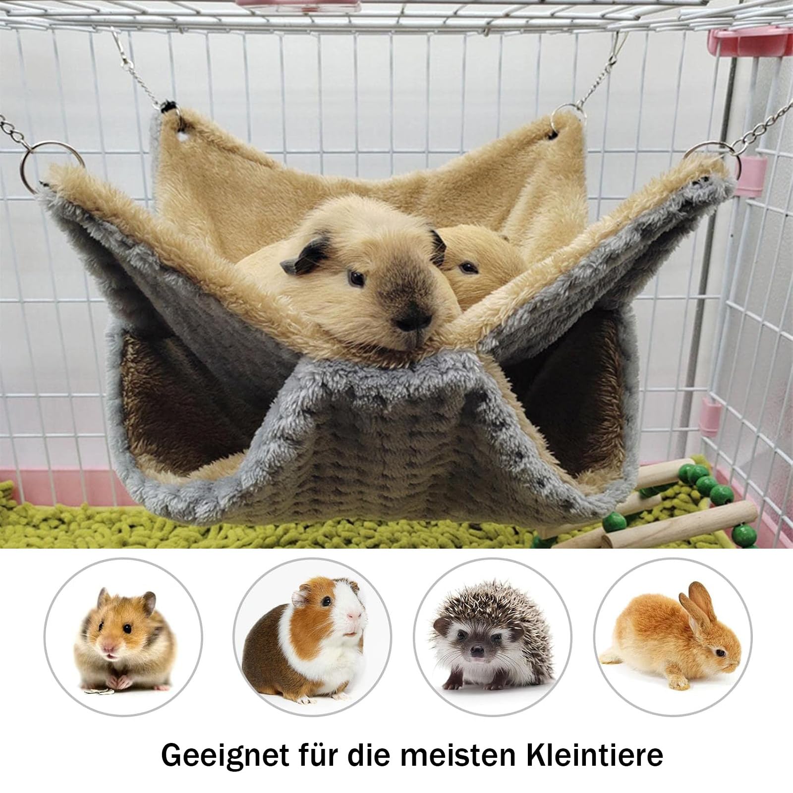 Oh wie süß! Deine kleinen Lieblinge werden diese Hängematte lieben! Mit 34x34cm ist sie groß genug für Meerschweinchen, Hamster, Ratten oder sogar zwei Frettchen. Das weiche Flanell-Material ist super kuschelig und wärmend. Besonders praktisch: Die zweilagige Design bietet Kletter- und Versteckmöglichkeiten. Mit den vier Metallhaken kannst du sie schnell im Käfig befestigen - oder einfach als gemütliches Bodenbett nutzen. Die Haken sind extra sicher vernäht. Reinigen ist auch kein Problem: Einfach Haken abmachen und in die Waschmaschine stecken. Deine Tiere werden es dir danken! Perfekt für Chinchillas, Rennmäuse und andere Kleintiere. Sieht nicht nur niedlich aus, sondern ist auch super praktisch.