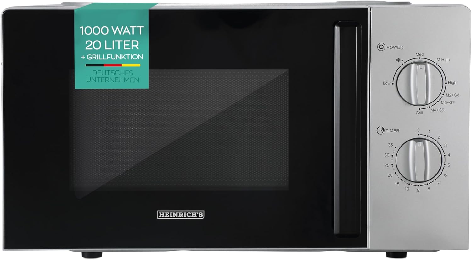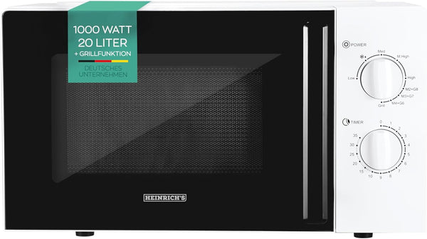 HEINRICHS Mikrowelle 20L Mit Grill - 1000W, 9 Stufen, Drehteller, Defrost, Weiß