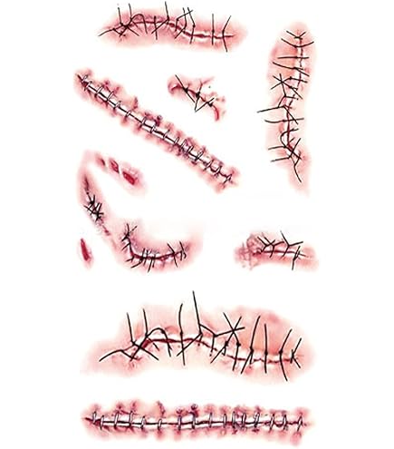 Richtig gruselig wird's mit diesem Halloween Horror-Set! 3 blutige Haarreifen mit Messer, Schere und Axt im Kopf sehen fast schon zu echt aus. Dazu 10 schaurige Narben-Tattoo-Aufkleber für den kompletten Grusel-Look. Aus leichtem Kunststoff, angenehm zu tragen und langlebig. Perfekt für Halloween-Partys, Cosplay, Vampir- oder Zombie-Events. Bring deine Gäste zum Schreien und kreier eine unvergessliche Horror-Atmosphäre. Einfach aufsetzen, Aufkleber anbringen und schon bist du der Schrecken der Party. Für alle, die's richtig krachen lassen wollen!