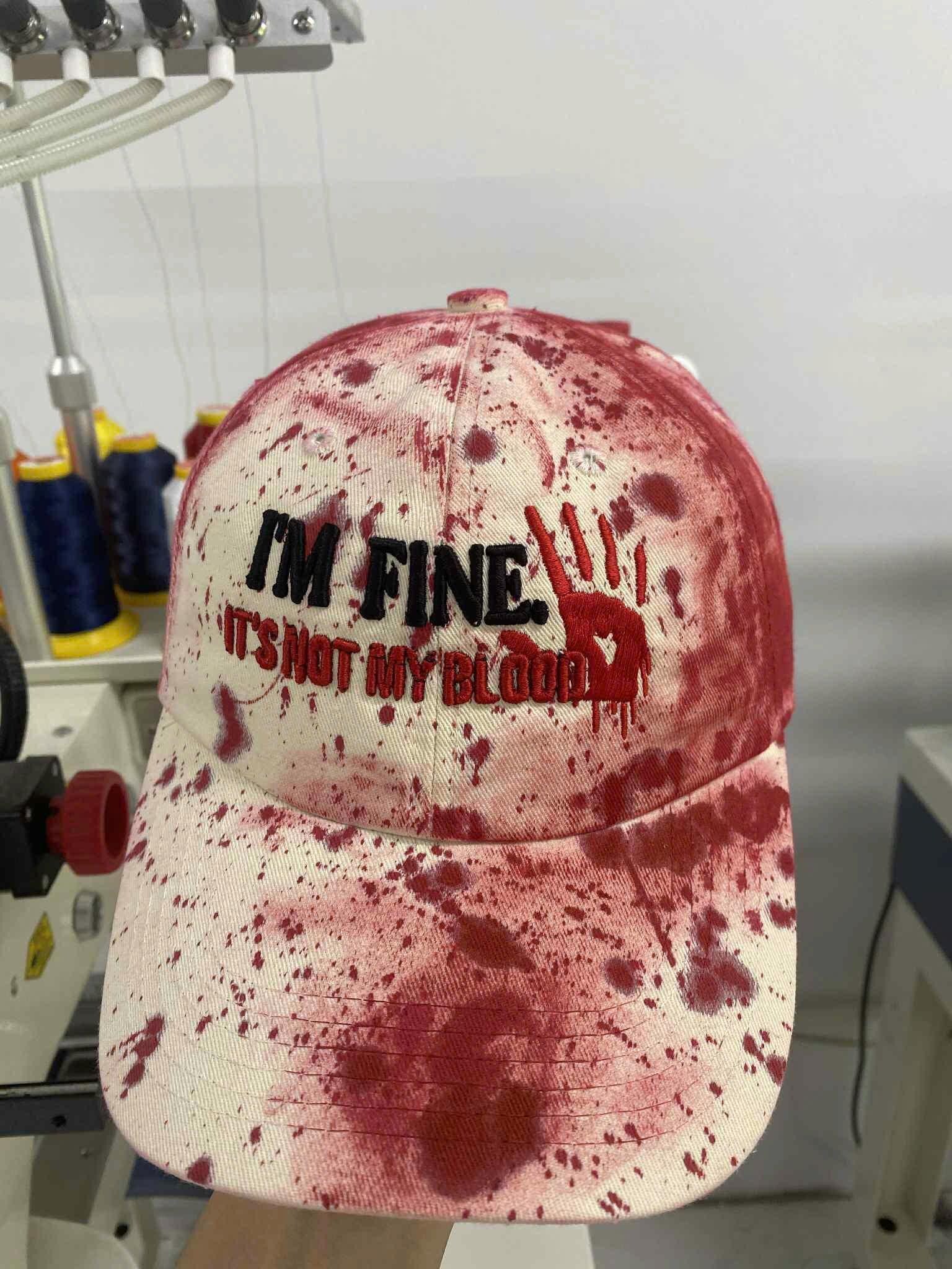 Perfect für deinen makaberen Humor! Dieser Baseball Cap mit der Aufschrift 'I'm Fine, It's Not My Blood' ist der absolute Hingucker auf jeder Halloween-Party. Der lässige Cap in Bloody-Optik passt zu jedem Grusel-Kostüm und sorgt für schaurig-schöne Lacher. Aus weichem, atmungsaktivem Material und mit verstellbarer Größe für Männer und Frauen. Egal ob du als Zombie, Serienkiller oder einfach nur mit schwarzer Kleidung unterwegs bist - dieser Hut komplettiert dein Outfit perfekt. Der klassische Design ist zeitlos und passt zu Jeans, Shorts oder T-Shirt. Auch nach Halloween super als Statement-Cap tragbar für alle, die's gruselig mögen. Mach deine Freunde neidisch mit diesem einzigartigen Accessoire - aber pass auf, dass dich nicht jemand für einen echten Bluter hält!
