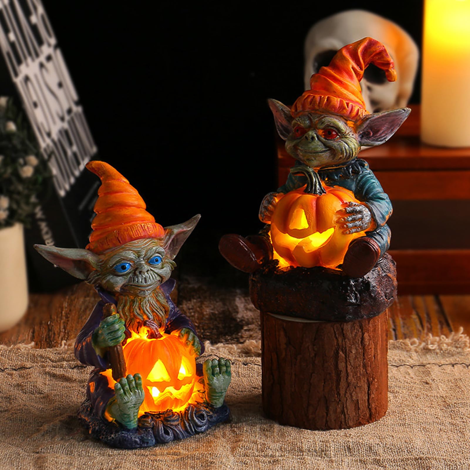Perfekt für die Halloween-Party, als Tischdeko oder einfach um den Vorgarten etwas gruseliger zu gestalten. Die kleinen Wichtel passen auf, dass niemand deinen Rasen betritt! Einfach aufstellen, LEDs anschalten und genießen.
