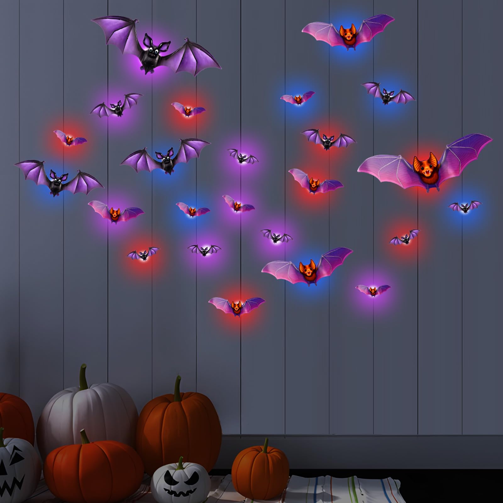Perfect für gruselige Halloween-Partys! Diese 24 LED-Fledermäuse in lila leuchten richtig cool und schaffen sofort gruselige Stimmung. Einfach an Fenstern, Wänden oder Türen ankleben - die 3D-Optik macht sie besonders realistisch. Aus umweltfreundlichem PVC Material und wiederverwendbar - jedes Jahr aufs Neue einsetzbar. Perfekt für Wohnzimmer, Schlafzimmer oder Party-Räume. Wenn es dunkel wird, leuchten sie in mystischem Lila - total beeindruckend! Kannst du kreativ arrangieren und verschiedene Muster bilden. Macht dein Zuhause zur gruseligen Höhle - ideal für Halloween-Feiern oder um Trick-or-Treat-Besucher zu beeindrucken. Einfach aufkleben, Licht anschalten und dich über die tolle Wirkung freuen!