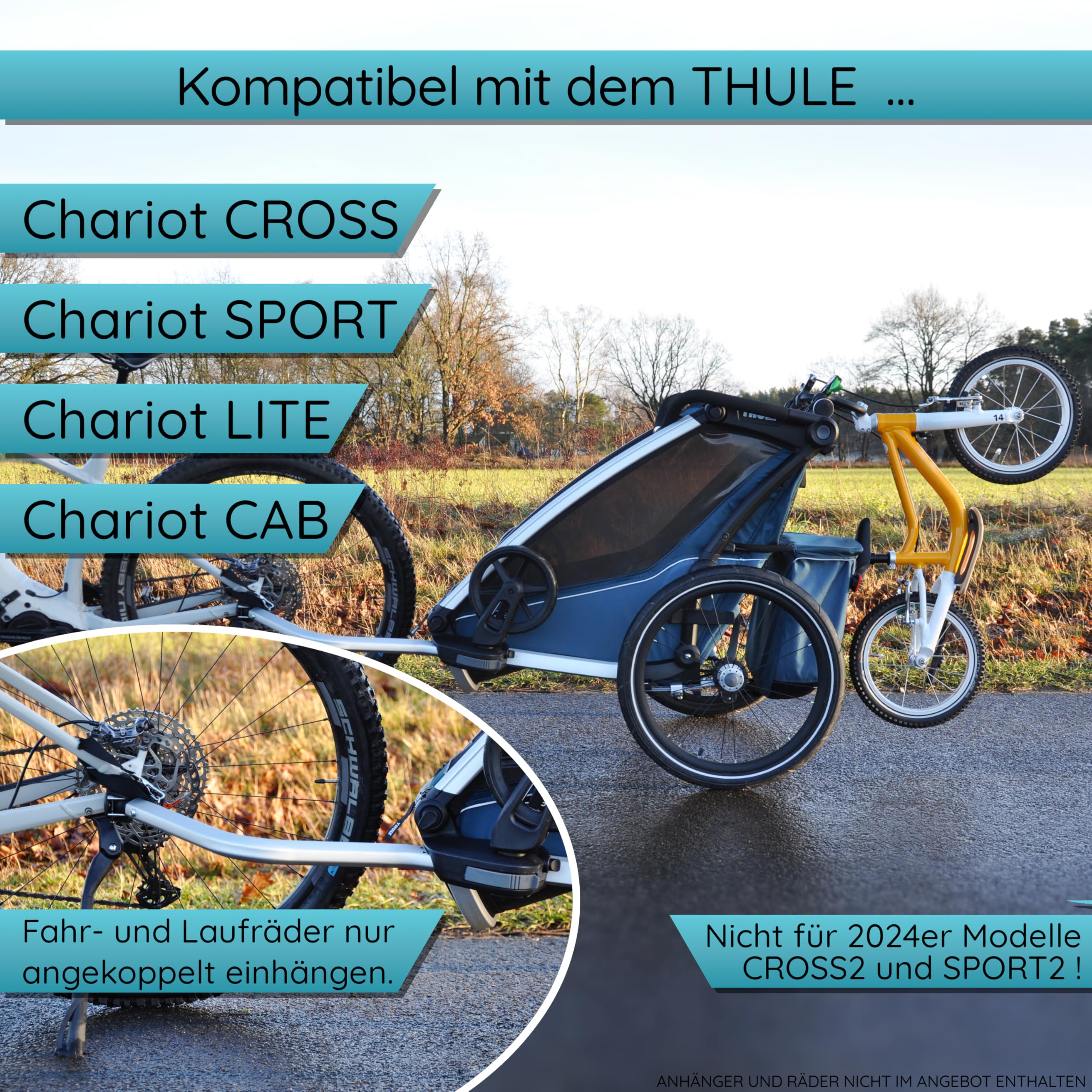 Super praktisch für Familien! Diese Universal-Halterung für Kinderfahrräder und Laufräder ist ein echter Game-Changer. Kompatibel mit allen Thule Chariot Anhängern - einfach dranklipsen und los geht's! Die Montage dauert nur Sekunden - komplett ohne Werkzeug. So kannst du nicht nur deine Kinder transportieren, sondern auch deren Räder mitnehmen. Perfekt für spontane Ausflüge wo die Kleinen mal fahren wollen. Der sichere Haltebügel fixiert das Rad bombenfest - auch auf holprigen Wegen nichts verrutscht. Passt für Räder bis 14 Zoll (bei Thule Chariot Cab sogar 16 Zoll). Ideal für Fahrräder, Laufräder und Roller. Macht Familienausflüge so viel flexibler - die Kids können fahren wann sie wollen. Einfach anschieben, einklinken, festmachen - fertig! So macht ihr den nächsten Ausflug zum vollen Erfolg. Einfach bestellen und mehr Freiheit genießen!