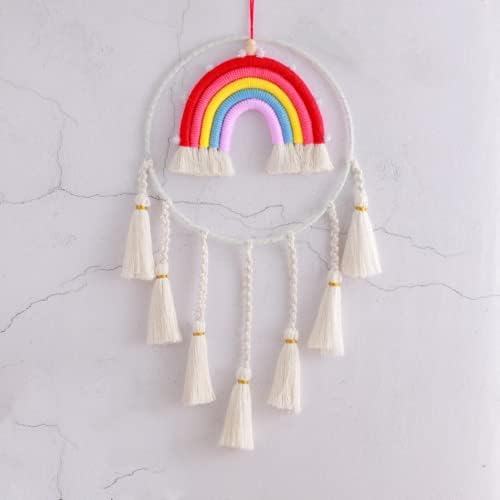 Bring Farbe in dein Zuhause mit diesem handgewebten Makramee Regenbogen Wandbehang! Mit ca. 15x25cm Größe ist er ein echter Hingucker an jeder Wand. Aus natürlichem Baumwollgarn und Wolle gefertigt - sicher, robust und angenehm in der Haptik. Der fünfsträngige Regenbogen mit bunten Pompon-Kugelanhängern und Holzperlen verbreitet sofort gute Laune. Perfekt fürs Kinderzimmer, Wohnzimmer, Flur oder sogar als Auto-Rückspiegel-Anhänger. Ein tolles Geschenk für Kinder und Freunde, das für gute Wünsche steht. Ob für Geburtstage, Weihnachten oder einfach so - dieser Regenbogen erhellt garantiert jeden Raum und jeden Tag!