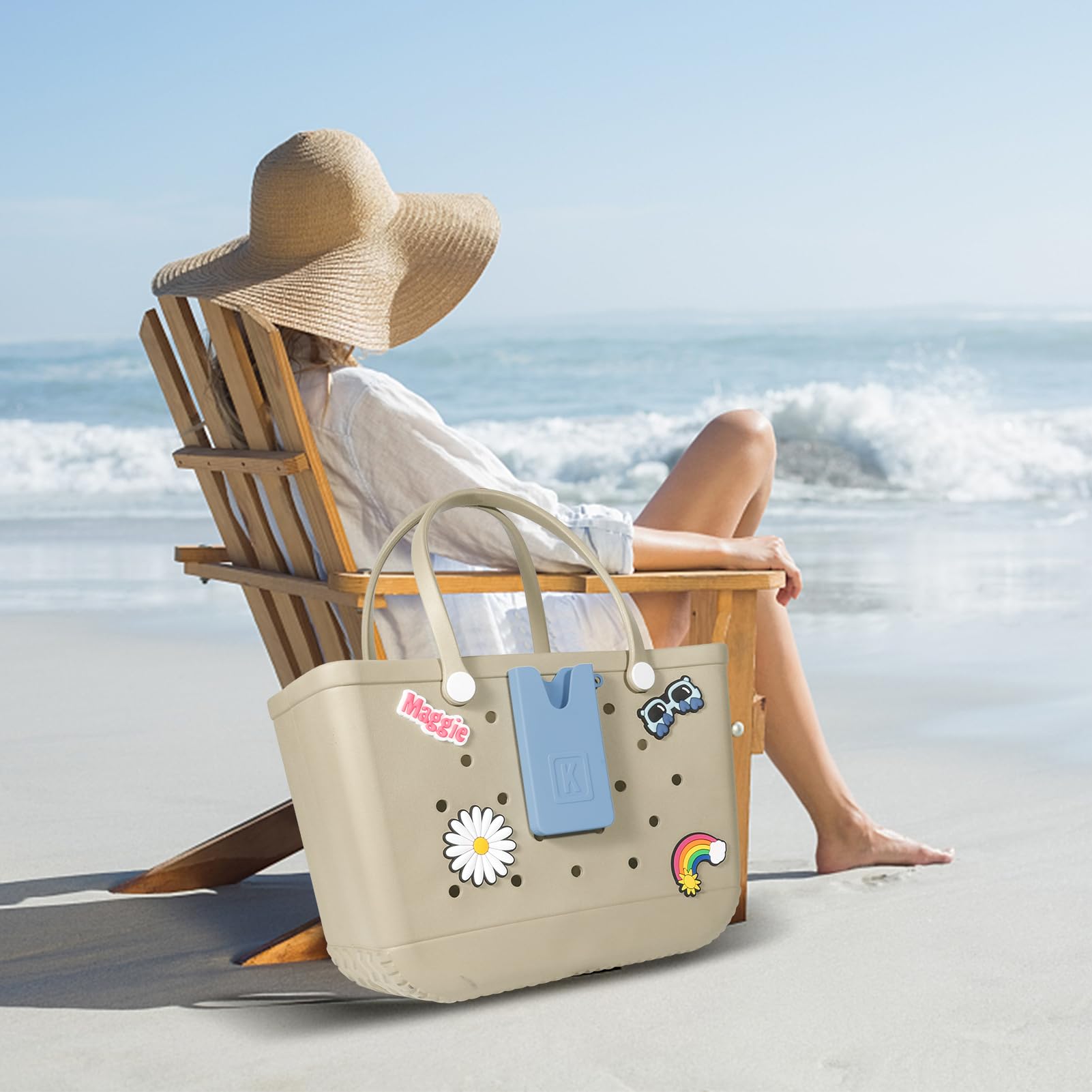 Dieser Silikon-Handyhalter ist das perfekte Zubehör für deine Bogg Bag! In schickem Blau mit Reißverschluss-Design - wasserdicht und super praktisch. Mit 4 Befestigungsknöpfen und 3 dekorativen Blumenknöpfen - hält bombenfest und sieht dabei noch hübsch aus. Nicht nur für Handys geeignet, sondern auch für Kleingeld, Karten, Schlüssel oder Sonnenbrillen. Das hochwertige Silikon ist weich, leicht und leicht zu reinigen. Perfekt für Strand, Schwimmbad oder Einkaufen - schützt deine Wertgegenstände vor Sand, Wasser und Sonne. Die Pastellfarbe passt zu nahezu jeder Strandtasche und macht sie gleich viel hübscher. Einfach die Knöpfe durch die Löcher deiner Bogg Bag stecken und schon ist dein Handy sicher verstaut - praktischer geht's nicht!