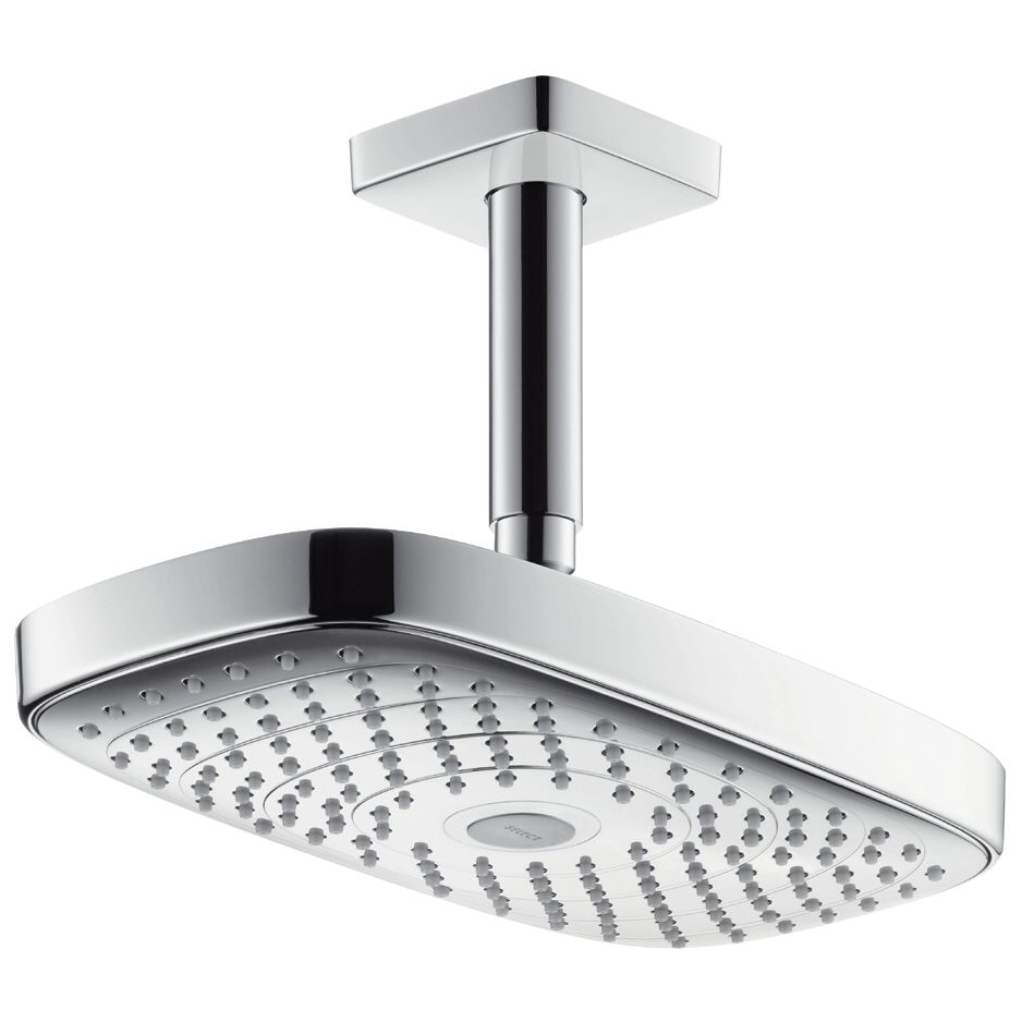 Duschvergnügen pur! Die hansgrohe Raindance E 300 Regendusche verwöhnt dich mit samtweichen Wassertropfen - fühlt sich an wie warmer Sommerregen. Die edle Gold-Optik setzt stylische Akzente im Bad und ist besonders langlebig. Mit 300x300 mm ist die Brause großzügig bemessen, und die RainAir Strahlart umhüllt den ganzen Körper. Kalk? Kein Problem! Einfach über die Silikondüsen wischen (QuickClean), und schon ist alles sauber. Die Strahlscheibe lässt sich sogar abnehmen für gründliche Reinigung. Bis zu 19 l/min Durchflussmenge bei 3 bar sorgen für reichlich Wasser. Der Brausearm für Deckenanschluss (100 mm) bringt den Duschkopf in die ideale Position. Perfekt kombiniert mit RainSelect Thermostaten für totale Kontrolle über Temperatur und Strahlart. Hansgrohe steht seit über 118 Jahren für deutsche Qualität und Innovation - ein echter Bad-Investment, das sich täglich lohnt!