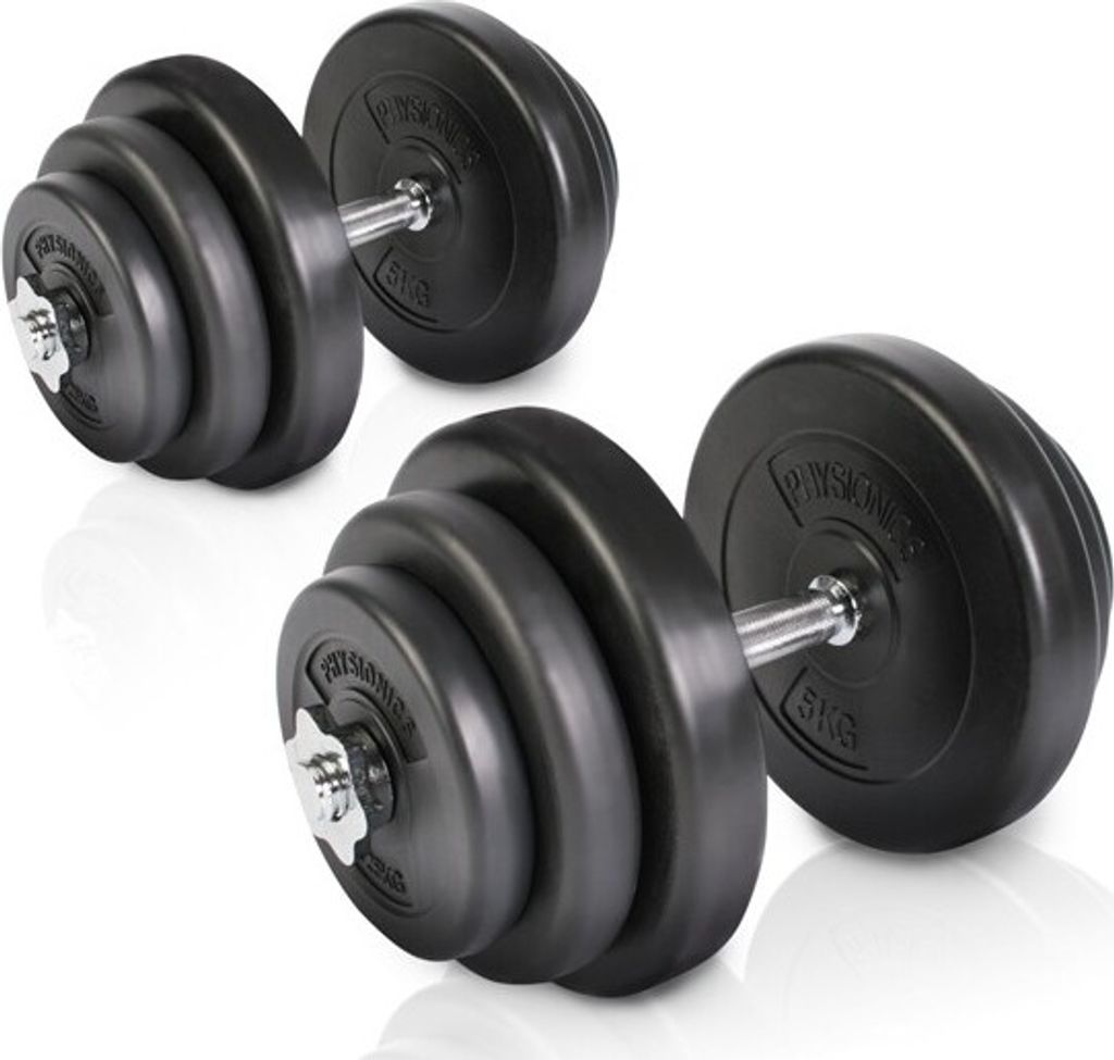 Im Lieferumfang ist alles dabei: 4x 1kg Scheiben, 4x 1,25kg Scheiben, 4x 2kg Scheiben, 2 Kurzhantelstangen, 4 Verschlüsse, 4 Endkappen und 1 Verbinder. Damit kannst du auch eine Langhantel zusammenbauen!