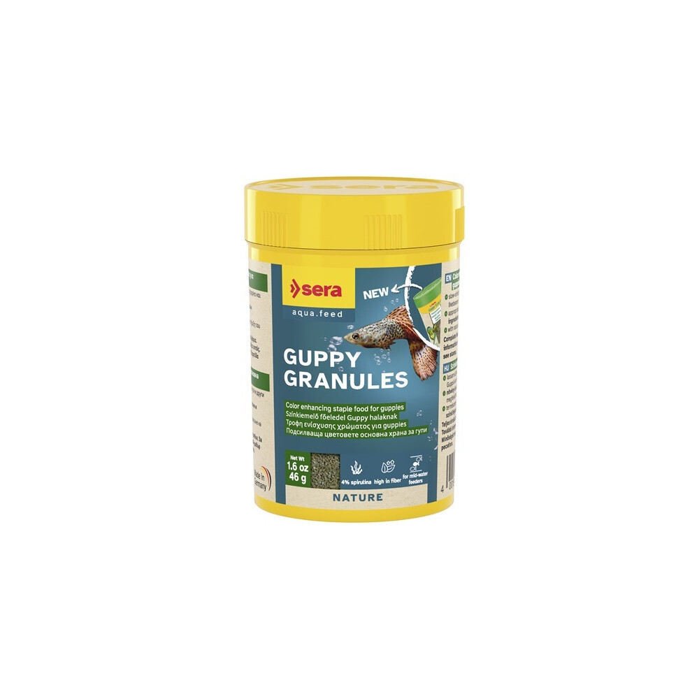 Deine Guppys werden's lieben! Die sera Guppy Granules sind das perfekte Hauptfutter für alle lebendgebärenden Zahnkarpfen. Ohne künstliche Farb- oder Konservierungsstoffe - nur das Beste für deine Fische!\n\nMit 100ml Inhalt (46g) hast du ne gute Portion für mehrere Wochen. Das langsam sinkende Granulat ist super weich und wird im Wasser schnell geschmeidig, ohne dabei zu zerfallen. Belastet kaum das Wasser - wichtig für klares, gesundes Aquariumwasser!\n\nDie ballaststoffreichen, pflanzlichen Zutaten und Spirulina mit vielen Carotinoiden sorgen für ne gesunde Verdauung und richtig prächtige Farben. Deine Guppys werden noch schöner!\n\nHochwertige Proteine und Fette unterstützen gesunden Nachwuchs und beugen Mangelerscheinungen vor. Einfach 1-2 mal täglich kleine Portionen füttern - deine Fische werden's dir danken!\n\nPerfektes Futter für alle, die ihre Guppys optimal versorgen wollen. Einfach bestellen und glückliche Fische genießen!