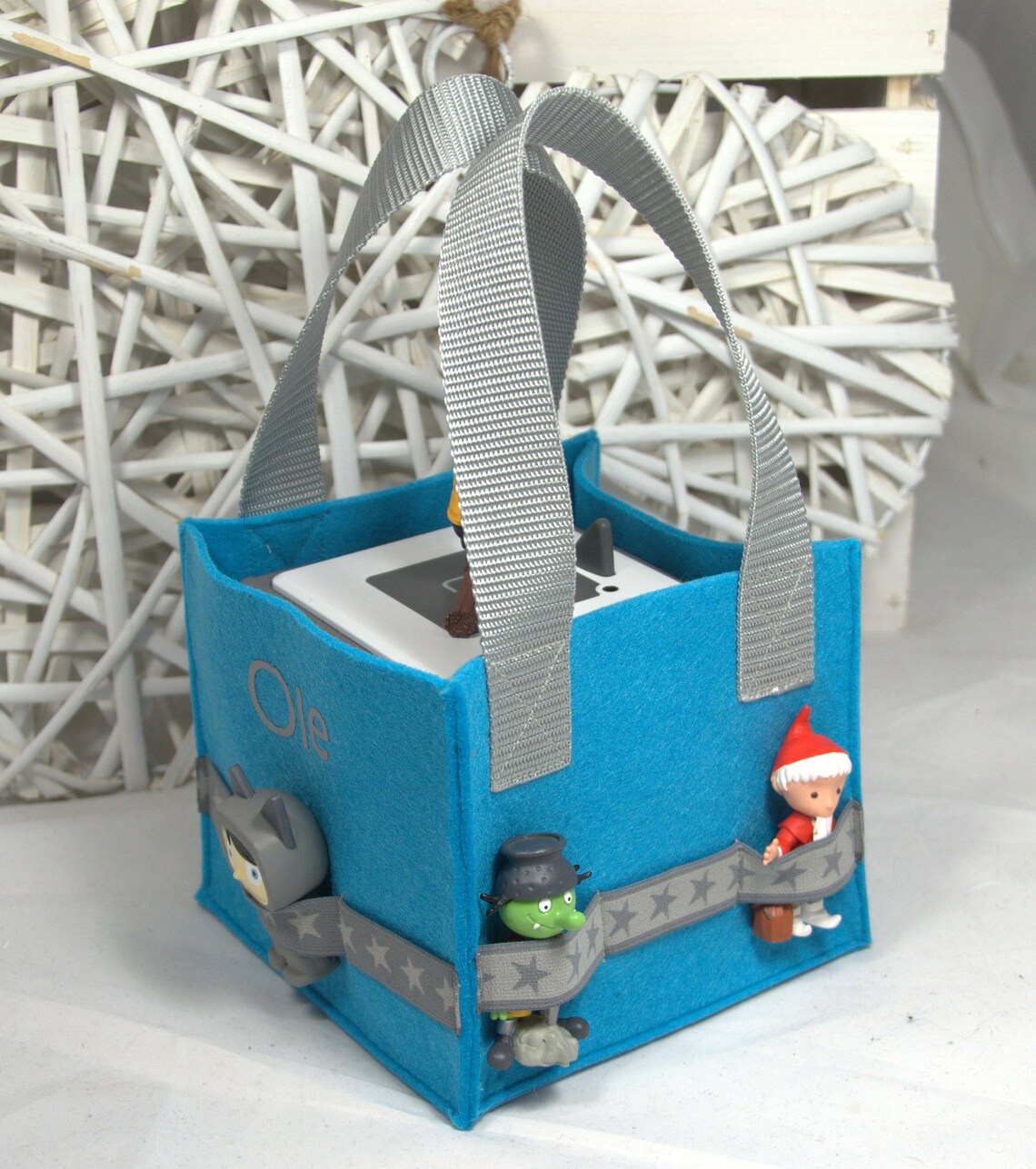 Alles für die Toniebox sicher verstaut! Diese süße Tasche im Waschbär-Design nimmt die Box und bis zu 10 Figuren mit. Perfekt für unterwegs oder zur Aufbewahrung.