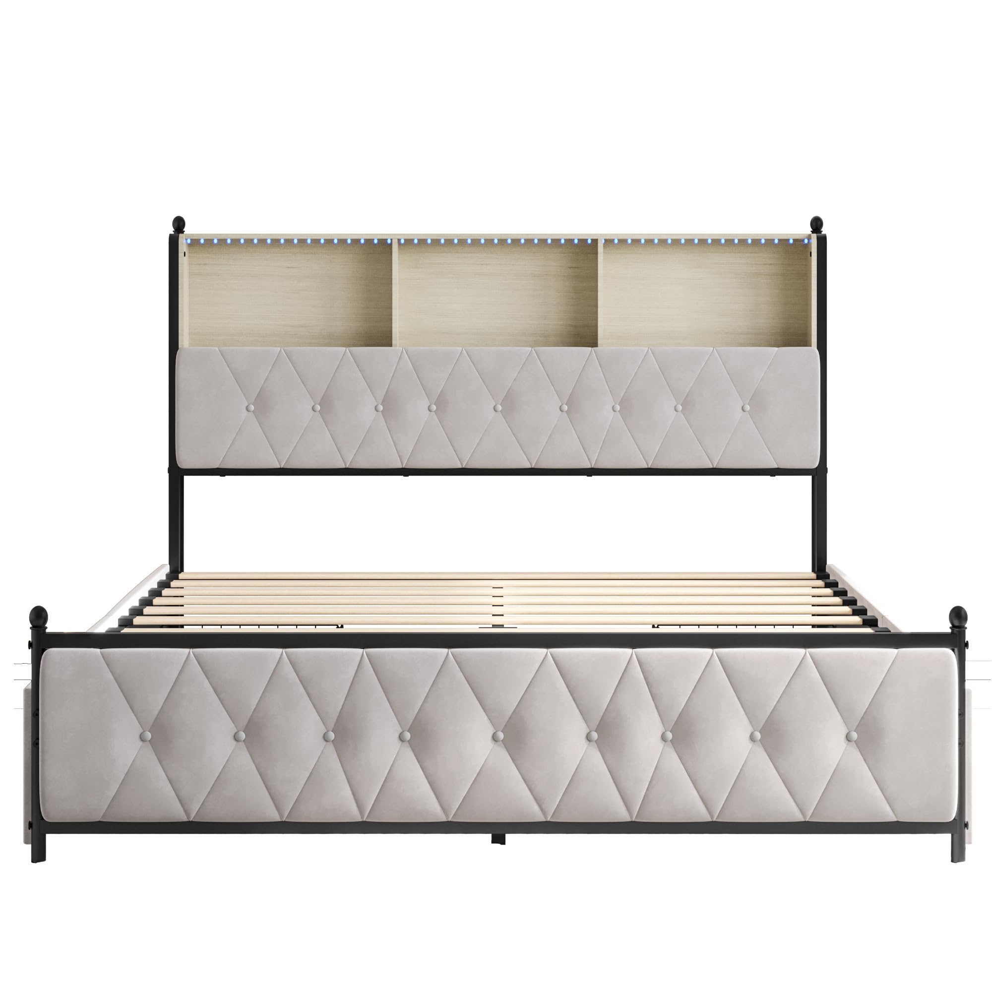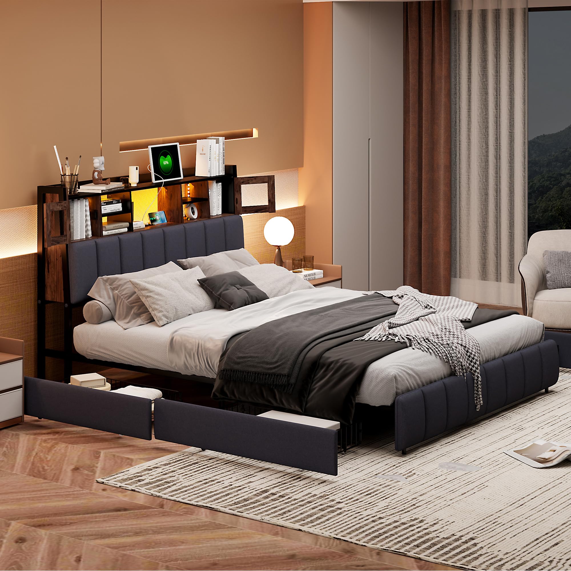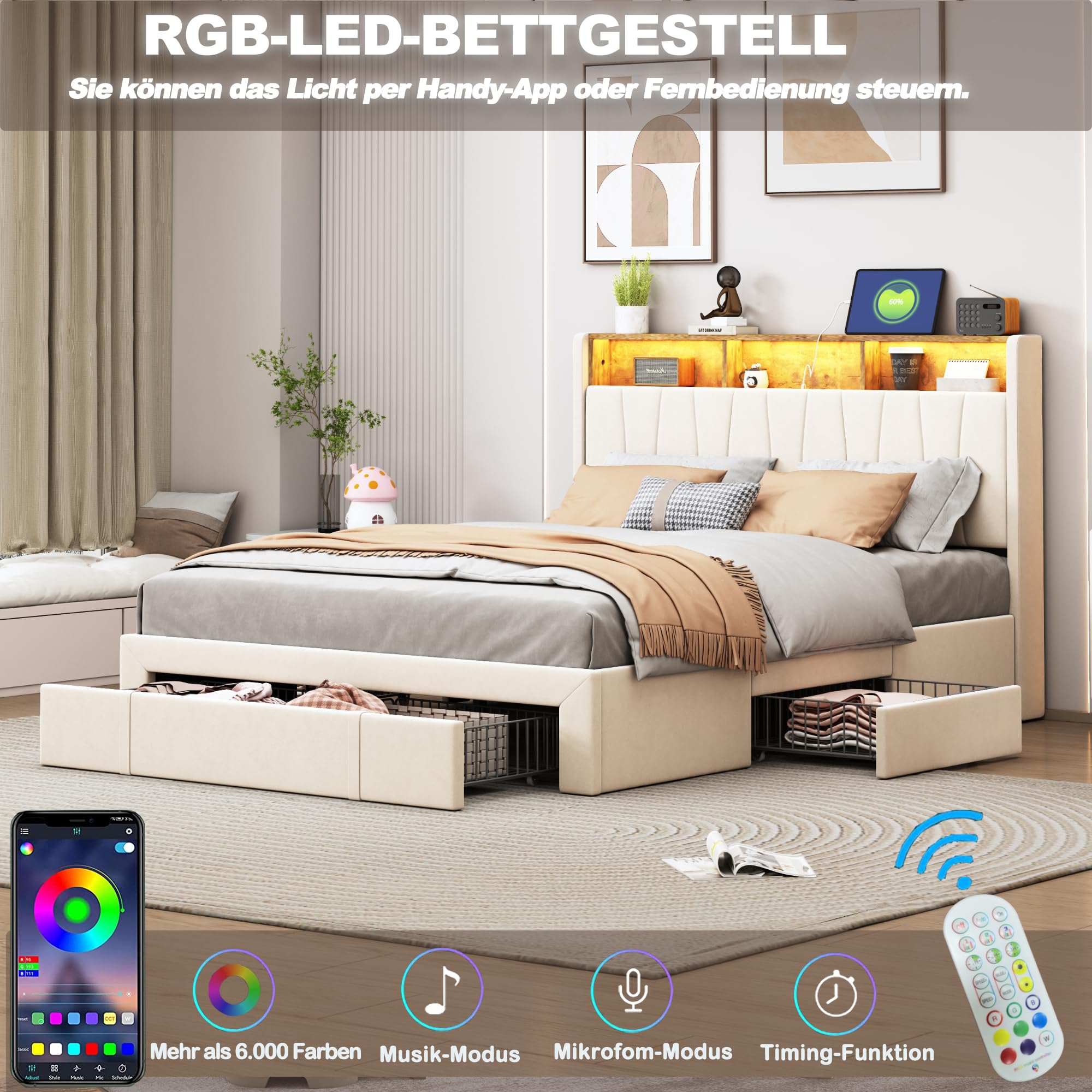 Wow, dieses Henunem Polsterbett hat alles was man sich wünscht! 140x200cm Doppelbett-Größe mit mega praktischen 4 Schubladen für Stauraum. Das LED-Kopfteil ist der absolute Hingucker - mit Fernbedienung Farben und Helligkeit einstellbar, plus USB-Ladefunktion für deine Geräte. Aus hochwertigem Leinen-Material mit Vintage-Muster - sieht einfach edel aus. Der Metallrahmen trägt bis zu 300kg und die zusätzlichen Stützbeine sorgen für maximale Stabilität. Die Schubladen haben Rollen und Schnallen - super praktisch! Wird in 2 Kartons geliefert (können an verschiedenen Tagen ankommen), Montagezeit ca. 30 Minuten. Ein Bett das nicht nur gut aussieht, sondern auch super funktional ist. Einfach bestellen und dein neues Traumbett genießen!