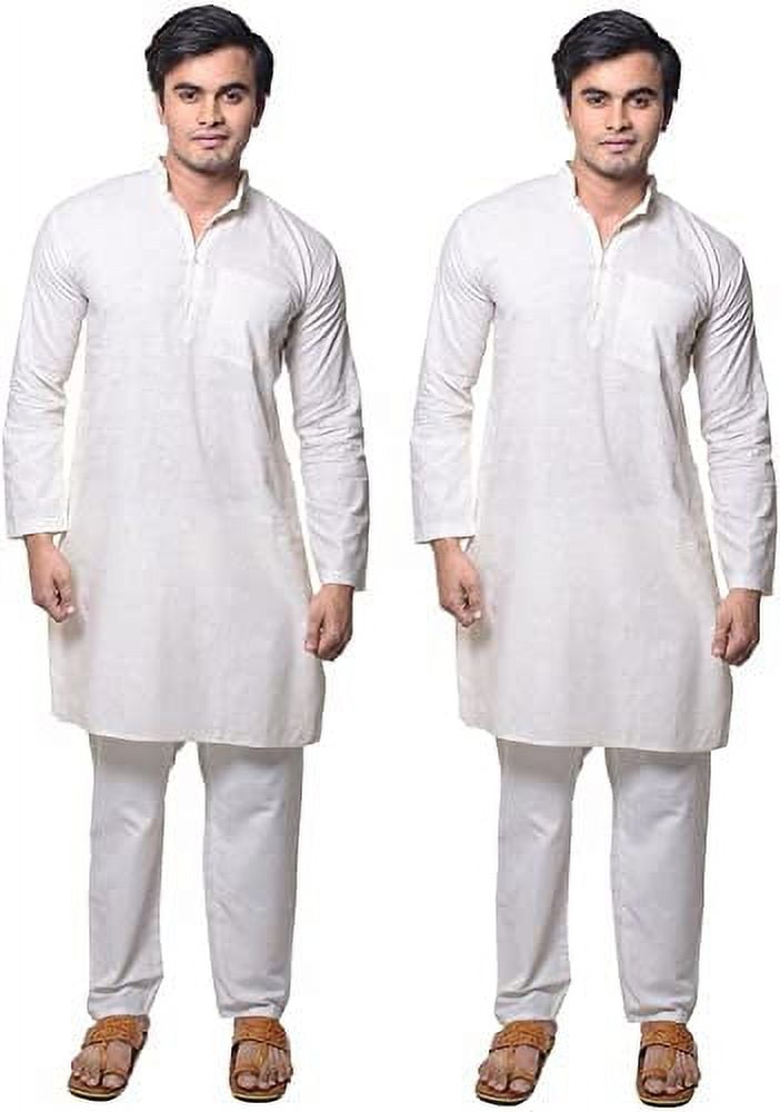 Dieses klassische Kurta Pyjama Set von Royal Kurta Vastramay ist perfekt für festliche Anlässe oder den täglichen Komfort! Hergestellt aus 100% reiner Baumwolle ist es super atmungsaktiv und hautfreundlich. Der Langarm-Kurta in strahlendem Weiß combined mit dem passenden Pyjama bietet einen eleganten, traditionellen Look. Größe 42 für die perfekte Passform. Pflegeleicht - einfach in der Maschine waschen (Kaltprogramm) oder zur chemischen Reinigung geben. Ideal für Hochzeiten, Feste, oder einfach um stylisch und bequem zu Hause zu entspannen. Ein Must-Have für jeden Herren, der Wert auf traditionelle Eleganz und Komfort legt!