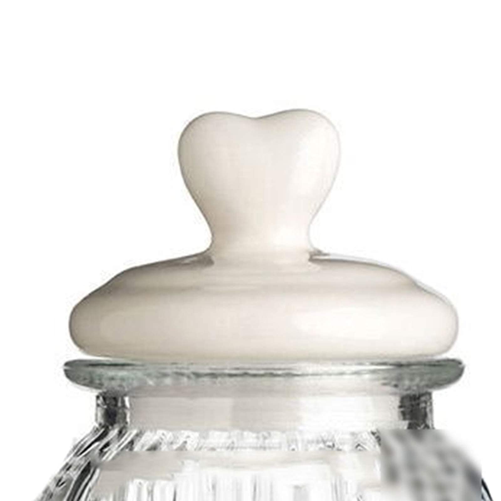 Wow, dieses Glas ist ja mal richtig hübsch! Der geriffelte Glas-Körper combined mit dem weißen Keramikdeckel - da freut sich das Auge. Und das Herz obendrauf ist das i-Tüpfelchen. \\n\\nPerfekt für Süßigkeiten, Kekse, Kaffeebohnen oder Tee. Aber ehrlich? Das Teil sieht so gut aus, dass du es einfach so als Deko hinstellen kannst. \\n\\nMaße: 12,5cm Durchmesser, 17,5cm hoch - also schön kompakt aber geräumig. Der Deckel schließt super dicht, alles bleibt frisch. \\n\\nSuper für die Küche, aber auch im Wohnzimmer macht sich das Glas richtig gut. Oder als Hochzeitsdekoration für den Candy-Table! Einzeln verpackt, kommt safe bei dir an. Einfach ein Hingucker!