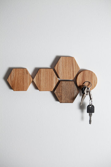 Dieser sechseckige Schlüsselhalter aus Eichenholz ist sowohl praktisch als auch dekorativ! Mit unsichtbaren starken Magneten, die Schlüssel, Messer oder Scheren sicher halten. Einfach zu montieren - entweder mit Schrauben oder Klebeband. Aus FSC-zertifiziertem Eichenholz, naturbehandelt. Perfekt für Flur, Küche oder Büro. Mit 8,4x7,4cm kompakt aber funktional. Sieht super aus und bringt Ordnung in deinen Alltag. Achtung: Nur für magnetische Gegenstände geeignet!