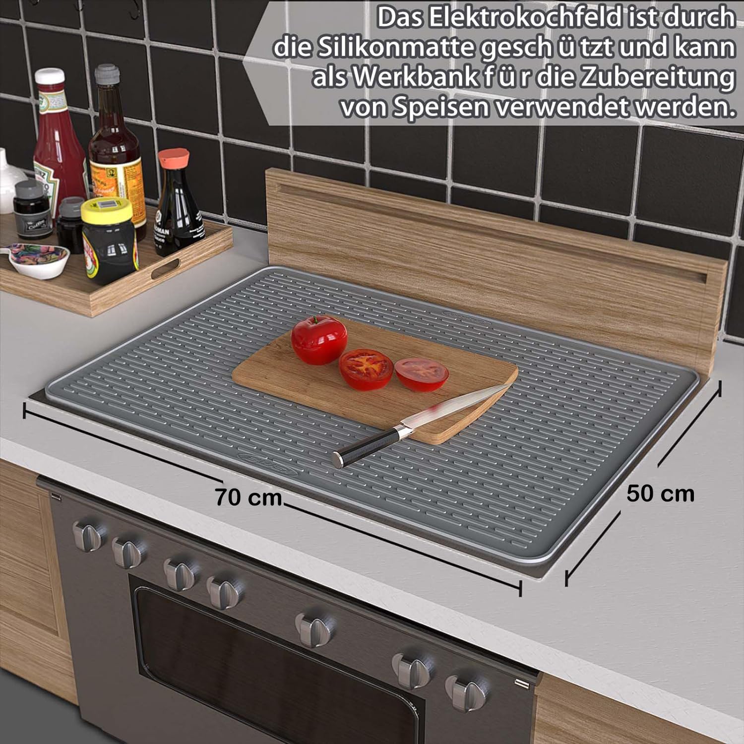 Endlich eine praktische Abdeckung für dein Ceranfeld! Diese Silikon-Matte in 71x51 cm schützt dein teures Kochfeld vor Kratzern, Spritzern und Flecken. Hitzebeständig bis 232°C - perfekt als Unterlage für heiße Töpfe oder als zusätzliche Arbeitsfläche. Rutschfest, wasserdicht und super einfach zu reinigen. Einfach in der Spülmaschine waschen oder per Hand abspülen. Besonders praktisch: Sie schützt auch vor neugierigen Haustieren! Wenn du mal nicht kochst, deckst du einfach ab und hast eine saubere, geschützte Oberfläche. Passt für Induktion, Ceran und Elektrokochfelder. Die graue Farbe ist dezent und passt in jede Küche. Flexibel zusammenrollbar für platzsparende Aufbewahrung.