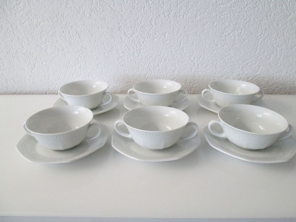 Perfekt für gemütliche Suppen-Momente! Dieses Holst Porzellan Suppentassen-Set im praktischen 2er Pack bringt Stil auf deinen Tisch. Jedes Set besteht aus einer schönen Suppentasse (0,30 Liter Inhalt) und passender Untertasse im klassischen Weiß.\n\nDie Suppentasse misst 11,0 cm Durchmesser und 5,3 cm Höhe, die Untertasse 16,6 cm Durchmesser. Aus echtem Hartporzellan bei über 1.320°C gebrannt - das garantiert Langlebigkeit und eine edle Optik. Temperaturbeständig bis 350°C, spülmaschinenfest und mikrowellengeeignet.\n\nIdeal für den täglichen Gebrauch oder besondere Anlässe. Ob heiße Suppe, Müsli oder einfach nur ein großer Tee - diese Tassen machen jedes Gericht zum Genuss. Das zeitlose Mondial-Design passt zu jedem Einrichtungsstil.\n\nMit ca. 556 Gramm pro Set fühlen sich die Tassen angenehm schwer und wertig in der Hand. Perfekt für Familien, Paare oder als Geschenk für Porzellan-Liebhaber. Hochwertiges Porzellan made in Germany - das sieht und spürt man!