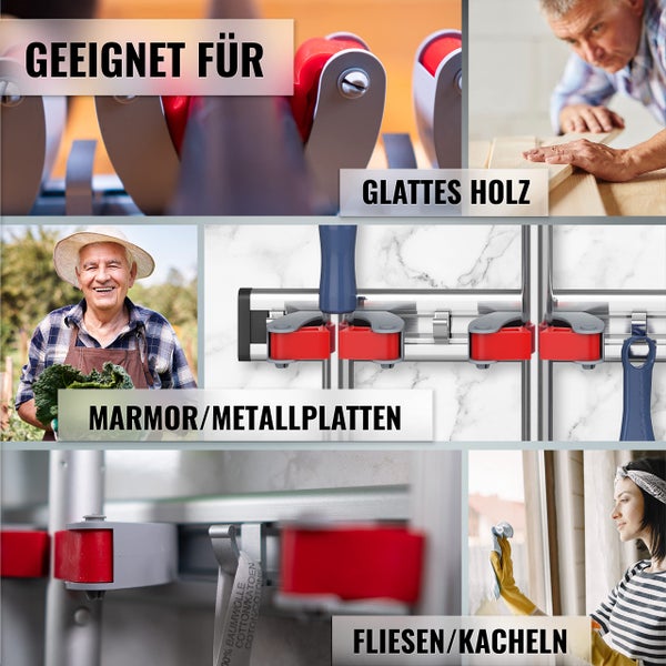 Endlich Ordnung in Garage und Hauswirtschaftsraum! Diese DUHARS Besenhalterung ist der absolute Game-Changer. Ohne Bohren - einfach über die Tür hängen und fertig! Aus schönem Holz mit rustikalem Look - sieht nicht nur praktisch aus, sondern auch noch dekorativ. Mit 4 Clips und 4 Haken - da passt alles drauf: Besen, Schaufeln, Werkzeuge... was auch immer rumliegt. Super platzsparend - nutzt den Türbereich optimal aus. Perfekt für Mieter - keine Löcher in der Wand! Robust verarbeitet - hält auch schwereren Geräten stand. Einfach umpositionierbar wenn's mal nicht passt. Schont deine Werkzeuge - nichts liegt mehr auf dem Boden rum. Für Garage, Keller, Gartenhaus - überall wo Ordnung nötig ist! Einfach genial dieses Teil - warum hat man das nicht früher gehabt?