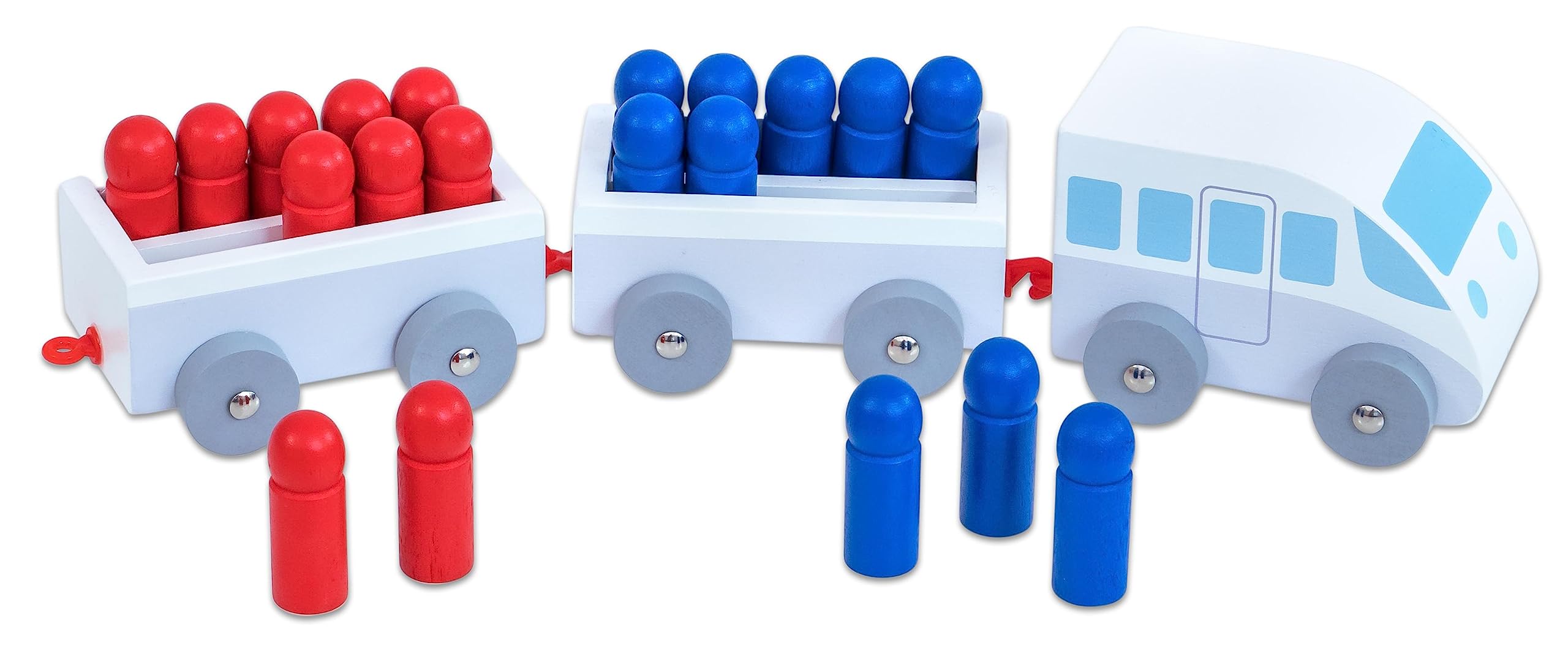 Mathe macht mit diesem Rechenzug aus Holz richtig Spaß! Perfekt für Grundschulkinder, um den Zahlenraum bis 20 oder 100 spielerisch zu entdecken. Mit roten und blauen Püppchen, die in die Waggons ein- und aussteigen - so wird der Zehnerübergang und das Rechnen mit Addition und Subtraktion zum Kinderspiel! Aus robustem Holz gefertigt, fühlt sich nicht nur gut an, sondern hält auch dem Schulalltag stand. Förderte nicht nur mathematisches Verständnis, sondern auch kreatives Denken, Problemlösungsfähigkeiten und soziales Lernen. Die Kinder können eigene Szenarien entwickeln: Wie viele Püppchen sind im Zug? Wie viele steigen aus? So wird Mathe greifbar und verständlich. Ideal für den Unterricht in der Grundschule, für zu Hause oder die Nachhilfe. Achtung: Nicht für Kinder unter 3 Jahren geeignet wegen verschluckbarer Kleinteile! Ein pädagogisch wertvolles Spielzeug, das Kinder lieben werden und das Lehrer empfehlen. Mach Lernen zum Abenteuer mit diesem zeitlosen Klassiker!