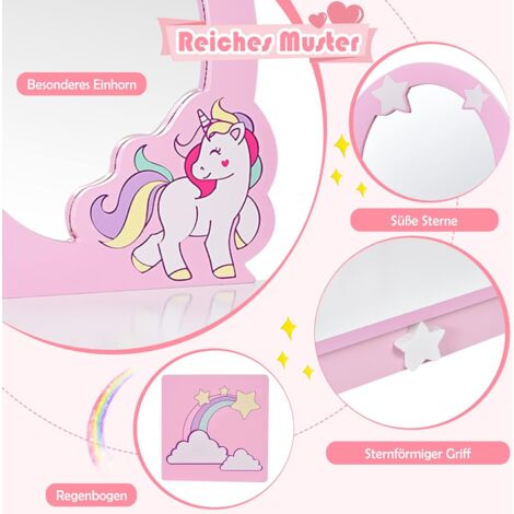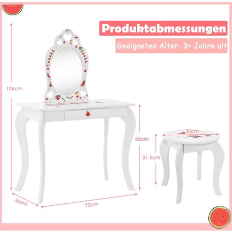 Oh, wie süß! Dieser rosa Schminktisch lässt Mädchenherzen höher schlagen. Aus stabilem MDF und Kiefernholz gebaut, hält er auch wildeste Schminkaktionen aus. Der dreifach klappbare Spiegel zeigt deiner kleinen Prinzessin jeden Winkel, und die praktische Schublade bietet Platz für Haargummis, Nagellack und alles, was sonst noch so zum Schminken gehört. Das Beste: Die Tischplatte ist abnehmbar - so wird aus dem Schminktisch im Handumdrehen ein Schreibtisch oder Lesetisch! Mit Anti-Rutsch-Füßen kratzt er nicht den Boden, und die abgerundeten Ecken sorgen für Sicherheit. Maße: Tisch 80x42x105 cm, Hocker 30x30x31,5 cm. Traglast Tisch 15 kg, Hocker 30 kg. Einfach aufbauen und los geht der Schminkspaß! Perfektes Geschenk für Geburtstage oder Weihnachten - da strahlen Kinderaugen!