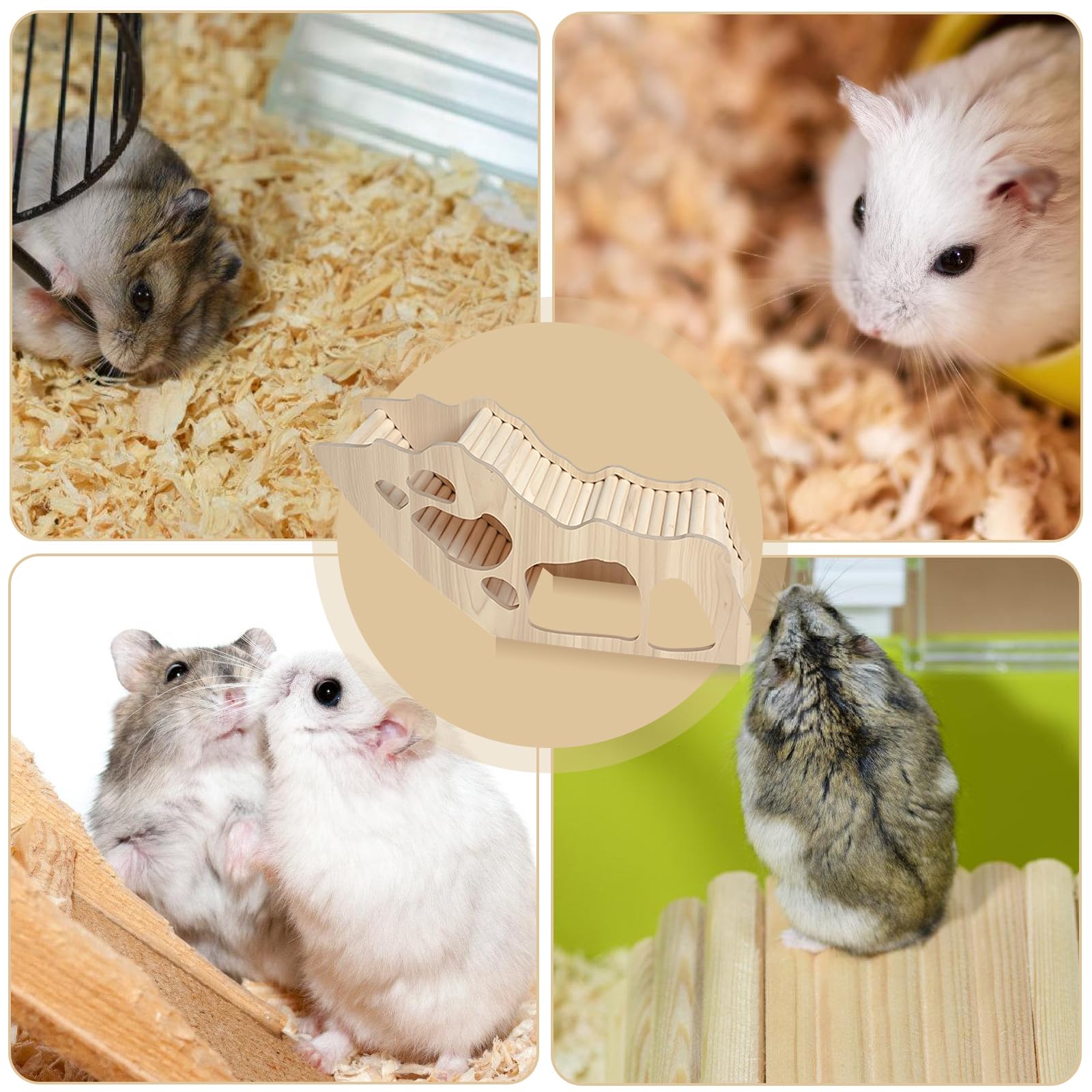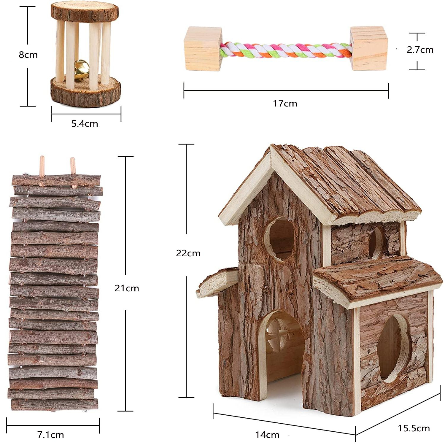 Dein Hamster wird's lieben! Dieses süße Spielset aus Naturholz bietet Versteckmöglichkeiten, Kletterabenteuer und Beschäftigung zugleich. Perfekt für Syrische Hamster, Zwerghamster, Mäuse und andere Kleintiere. Einfach zusammenzubauen ohne Werkzeug - das modulare System lässt sich immer wieder neu gestalten. Die glatten Oberflächen sind kaufsicher und chemiefrei. Dein Tier kann klettern, sich verstecken und gleichzeitig seine Zähne abwetzen. Mach den Käfig zur Erlebniswelt und fördere das natürliche Verhalten deines Lieblings. Aus hochwertigem Holz mit wasserfester Beschichtung - leicht zu reinigen und langlebig. Tierisch gut!