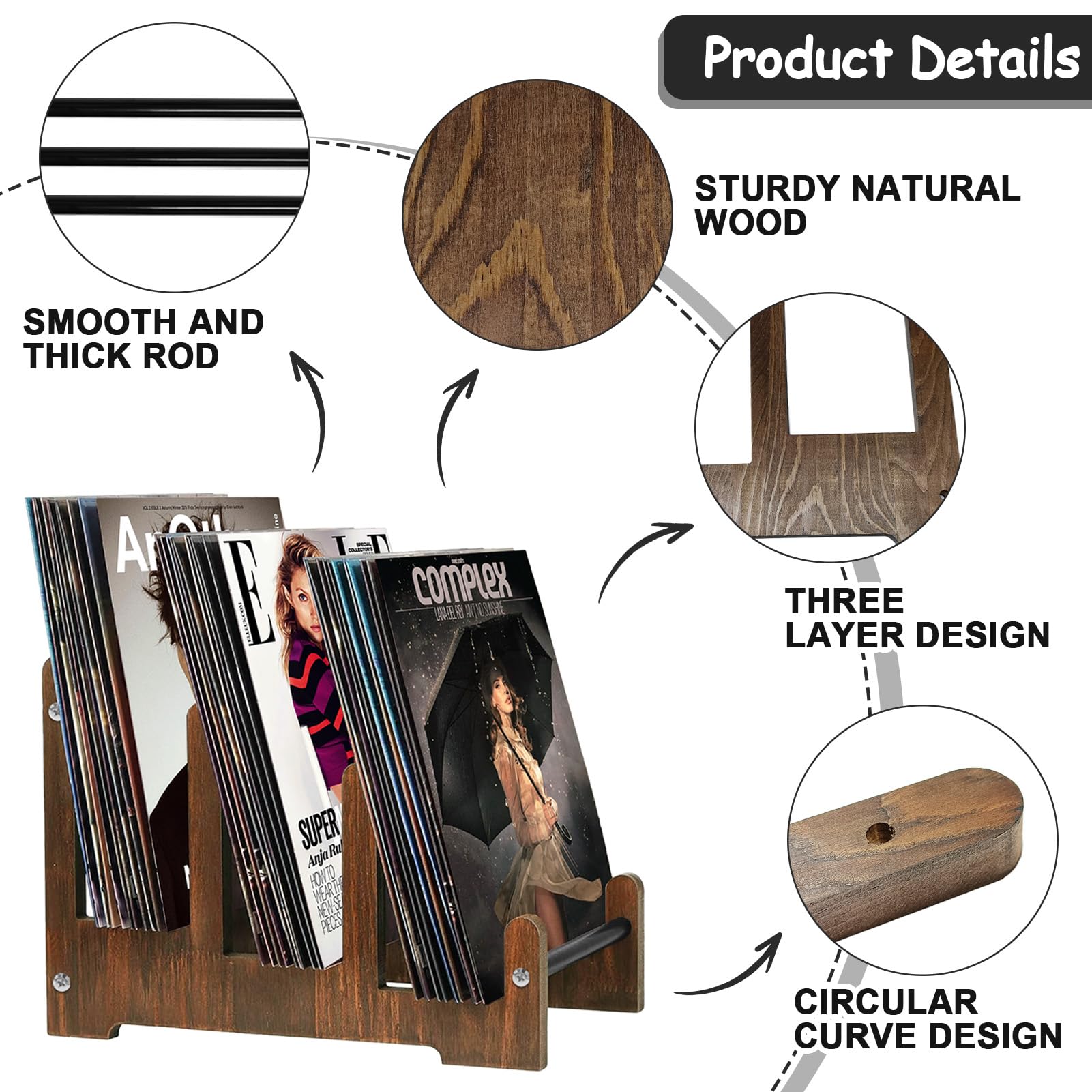 Dieser Schallplattenständer ist ja ein richtiger Hingucker! Aus nachhaltigem Holz gefertigt, bringt er natürlichen Charme in dein Zuhause. Mit den Maßen 37x27x24 cm bietet er Platz für ganze 60 Schallplatten - das sind 20 pro Ebene! Die 4 verstärkten Querträger und 3 stabilen Etagen sorgen dafür, dass auch bei voller Beladung nichts durchhängt oder wackelt. Aber nicht nur für Vinyl super - auch Fotoalben, Bücher oder Zeitschriften finden hier Platz. Das Retro-Design in warmen Holztönen passt in jedes Wohnzimmer oder Musikzimmer. Perfekt als Geschenk für Musikliebhaber, zum Geburtstag oder einfach als Deko für die eigene Sammlung. Einfach aufstellen und deine Schallplatten endlich ordentlich und griffbereit präsentieren! Ein must-have für jeden Vinyl-Fan.