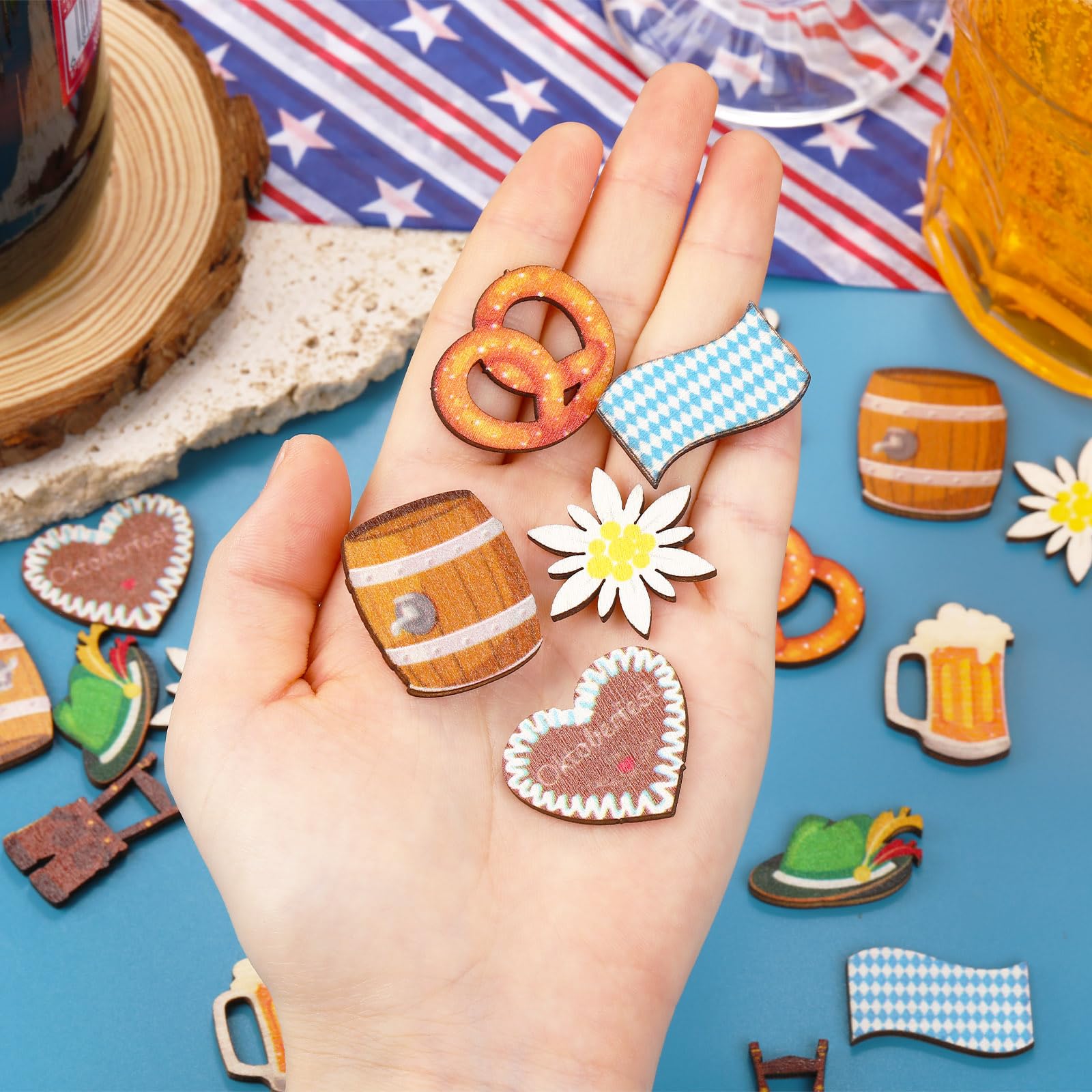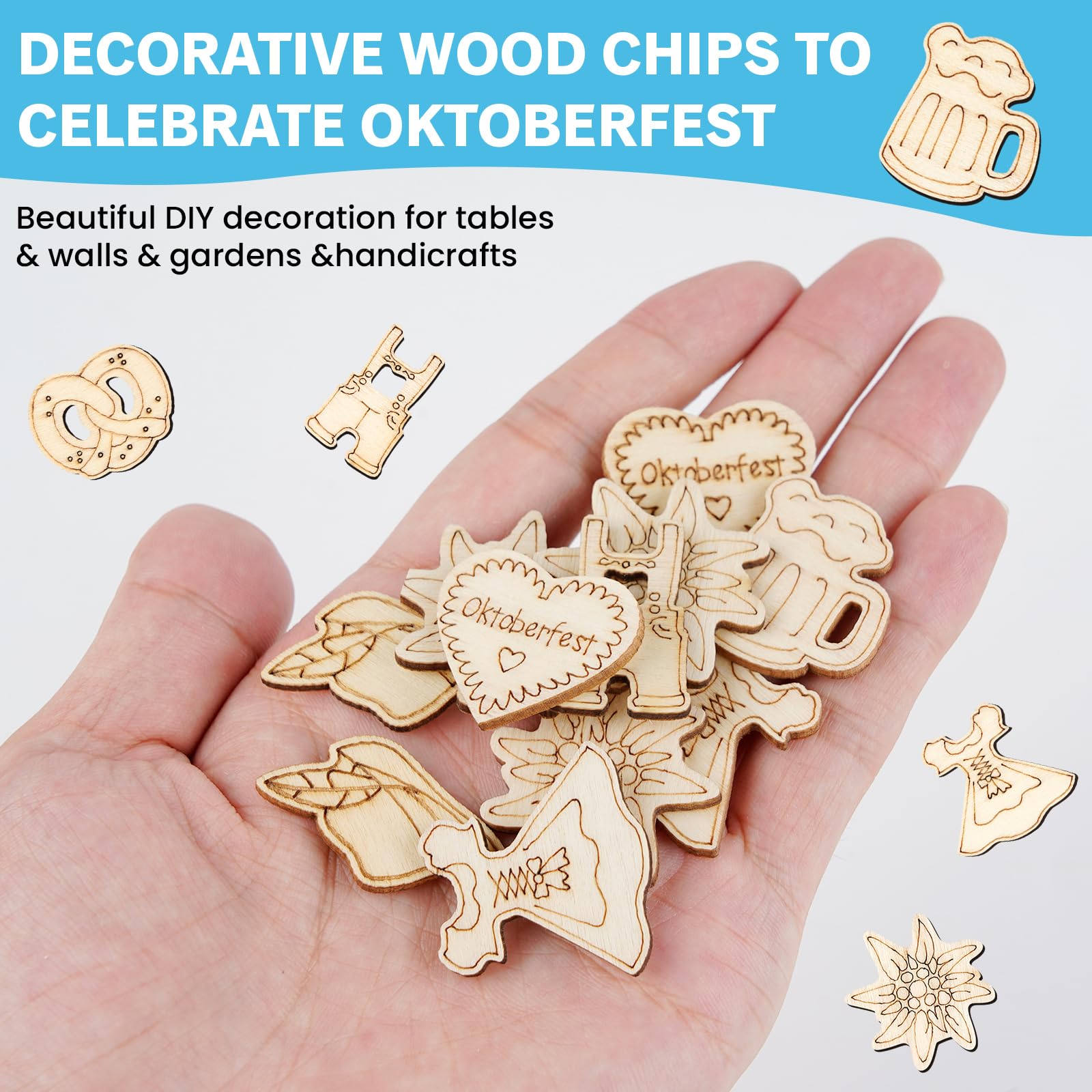 Jetzt wird's bayerisch! Mit diesen 200 Stück Oktoberfest Holzkonfetti machst du jede Party zum Hit. Da sind alle klassischen Motive dabei: Bierkrüge, Brezeln, Edelweiß, Dirndl und Lederhosen - einfach urig! Die Teile sind aus nem robusten Holz gemacht und mit Laser geschnitten, sodass die Kanten super glatt sind ohne scharfe Ecken. Mit 3-4 cm Größe sind sie genau richtig um auf Tischen, dem Boden oder sogar auf Kuchen nen mega Effekt zu machen. Du kannst die Motive frei kombinieren und dir deine eigene Deko zusammenstellen - da ist deiner Kreativität keine Grenze gesetzt. Ob ne gemütliche Feier daheim, ne große Oktoberfest-Party oder ne ländliche Hochzeit - diese Holzkonfetti passen immer. Auch super für Geschenkverpackungen oder Bastelprojekte. Einfach ausstreuen und schon hast du ne authentische bayerische Atmosphäre. Deine Gäste werden begeistert sein - Prost!