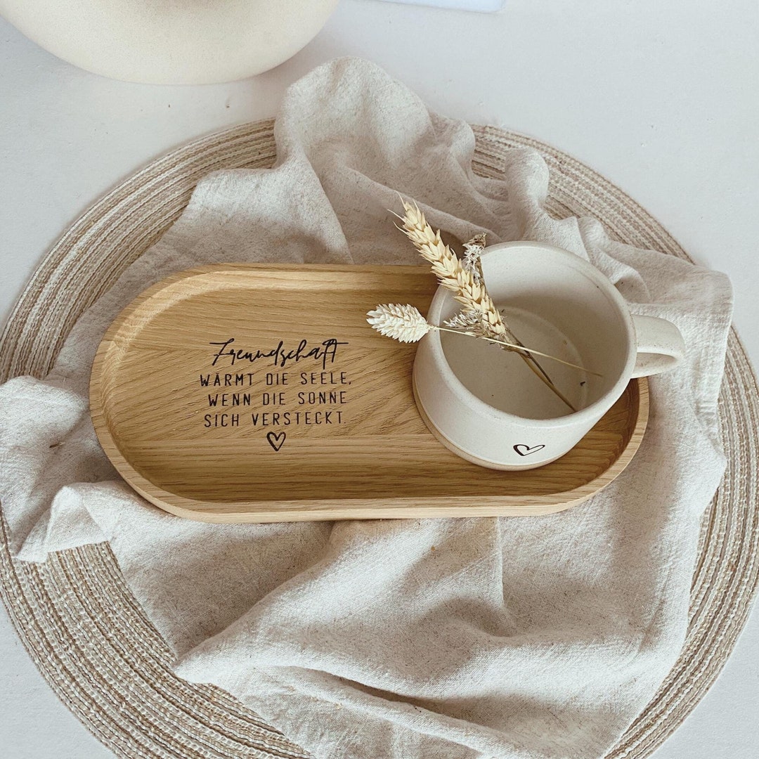 Zeig deiner besten Freundin, wie viel sie dir bedeutet! Dieses handgefertigte Holztablett mit der Gravur 'Freundschaft ist das schönste Geschenk' ist das perfekte persönliche Geschenk für besondere Anlässe. Im Format 19,5 x 11,5 cm ist es ideal für Schmuck, eine Tasse Tee oder als Deko-Element. Wähle aus sechs verschiedenen Gravur-Optionen und mach das Tablett ganz individuell. Optional erhältlich mit passender Tasse in Anthrazit oder Weiß. Aus hochwertigem europäischem Holz gefertigt - kein Billig-Import. Ein Geschenk, das von Herzen kommt und garantiert Freude macht!