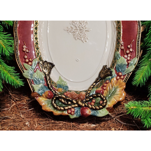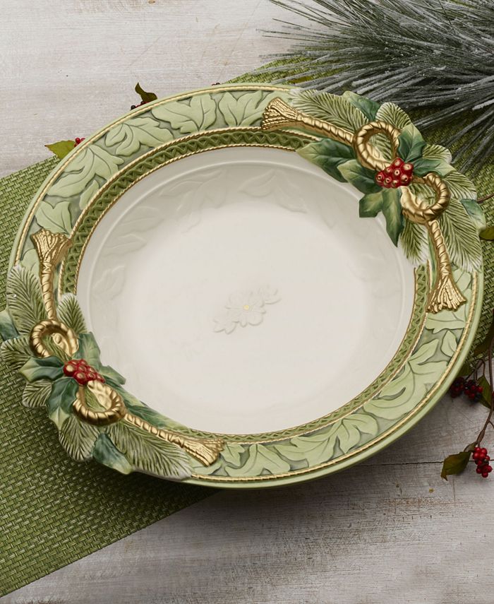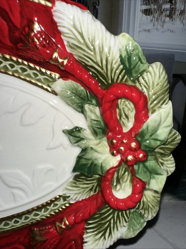 Wow, diese Servierschüssel von Fitz and Floyd bringt weihnachtlichen Zauber auf deinen Tisch! Aus hochwertigem Steingut handbemalt, ist sie ein echter Hingucker mit ihrem Weihnachtsstern-Rand, Tannenzweigen, Beeren und roten Quasten. Die dezent geprägte weiße Mitte wird von einer eleganten grün-goldenen Girlande umrahmt. Mit stolzen 40,6 cm Länge, 36,7 cm Breite und 6,4 Litern Fassungsvermögen findest du hier reichlich Platz für Gemüse, Braten, Brot, Kekse oder was auch immer du servieren möchtest. Perfekt für die festliche Tafel - aber so schön, dass du sie sicher auch außerhalb der Weihnachtszeit zeigen willst! Achtung: Nur Handwäsche, damit die wunderschönen Details lange erhalten bleiben. Ein echter Eyecatcher, der deine Gäste begeistern wird und zu einer festlichen Tradition in deinem Zuhause wird!
