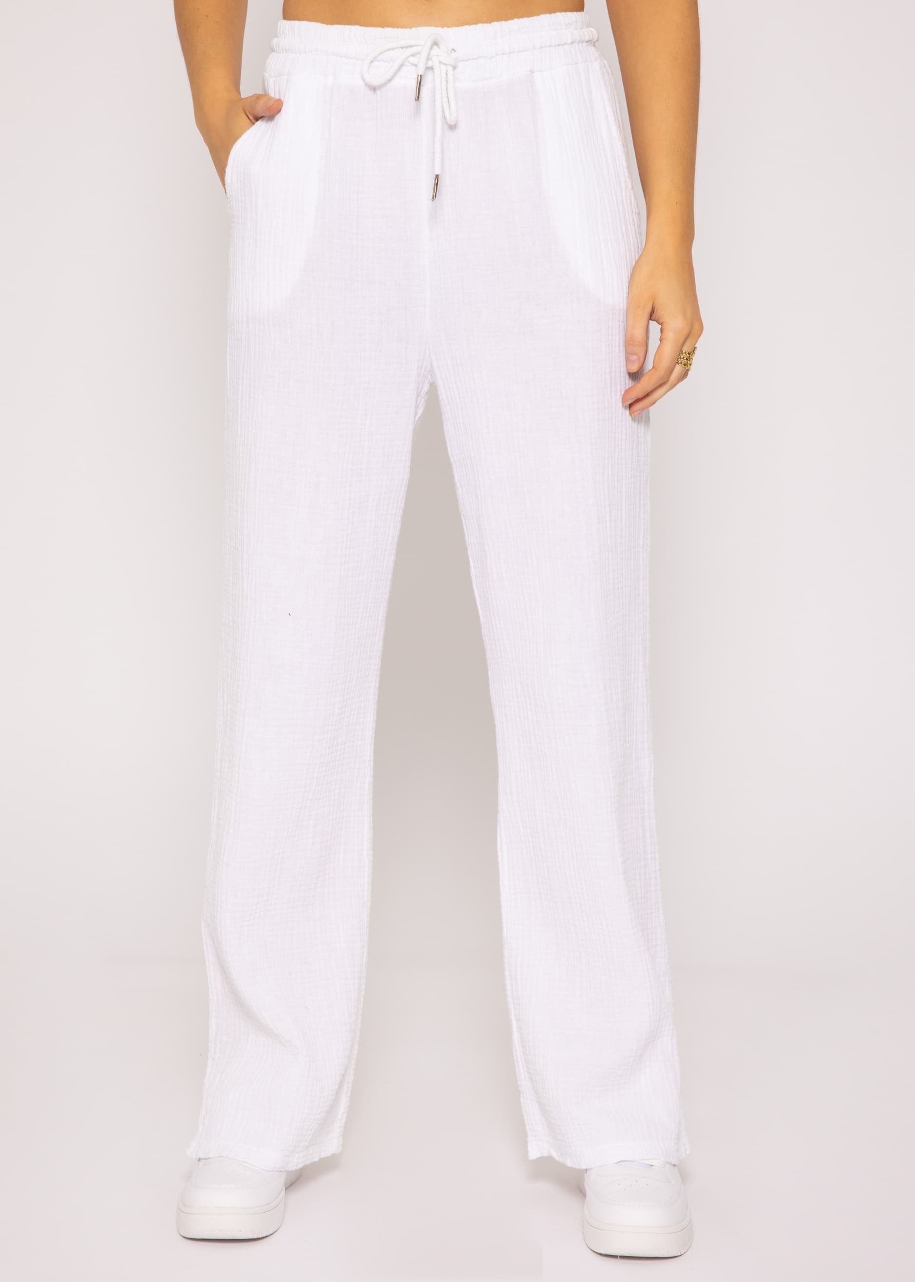 Perfekte Sommerhose für heiße Tage! Diese leichte Musselin-Hose in 3/4-Länge fühlt sich an wie ein zweite Haut - super weich und atmungsaktiv. Der breite Gummibund mit Kordelzug sitzt bequem an der Taille ohne zu drücken. Mit praktischen Seitentaschen für dein Handy und Kleingeld. Der lockere Baggy-Schnitt kaschiert Problemzonen und lässt deine Beine länger wirken. Erhältlich in klassischen Farben wie Schwarz, Khaki und Weiß - total vielseitig kombinierbar mit T-Shirts, Blusen oder Tuniken. Perfekt für Strandtage, Stadtbummel, Yoga oder einfach nur zum Chillen zu Hause. Die dünne Stoffqualität kühlt angenehm und leitet Feuchtigkeit super ab. Ein echter Allrounder für den Sommer!