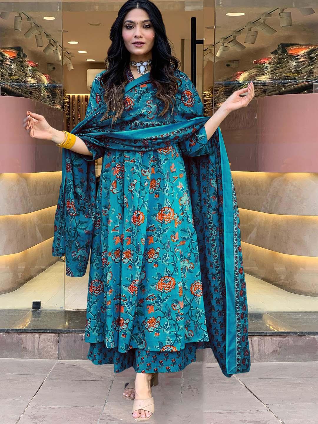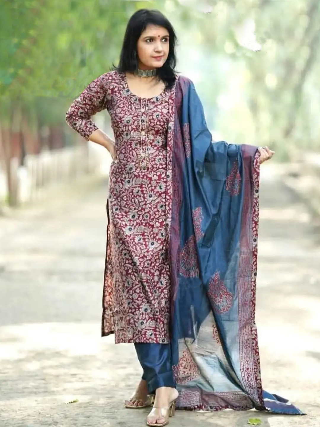 GoSriKi Damen Kurta Set - Viskose Mit Hose & Dupatta | Weinrot Bedruckt | Größen S-XXL