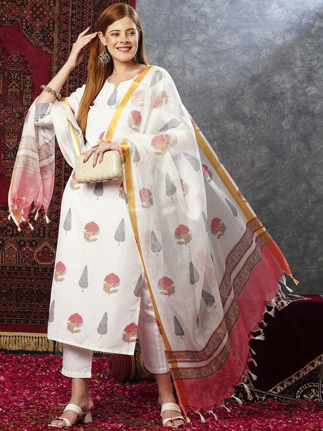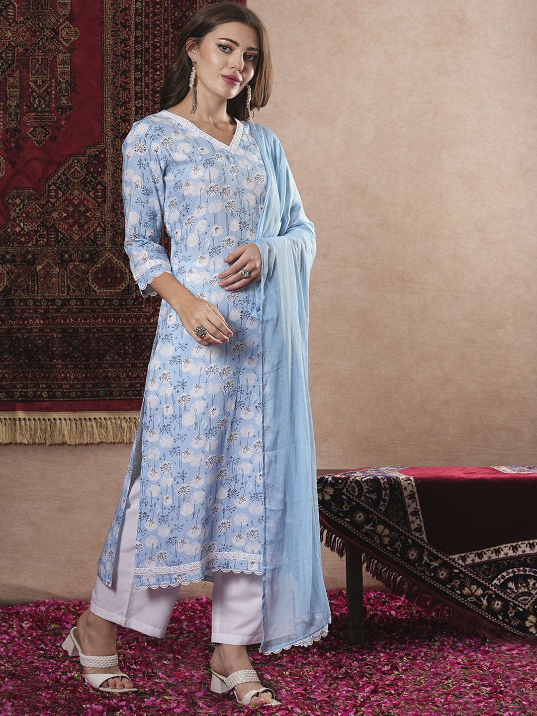 Dieses wunderschöne Kurta-Set von GoSriKi ist ein absoluter Hingucker! Aus weicher Viskose-Baumwolle-Mischung fühlt es sich super angenehm an. Im Set enthalten: Kurta, Hose und Dupatta in elegantem Weinrot mit Bandhej-Druck. Die gerade Silhouette mit 3/4-Ärmeln und Rundhalsausschnitt sitzt perfekt. Egal ob für traditionelle Anlässe, Partys oder einfach mal was Anderes im Alltag - mit diesem Set bist du immer stylisch unterwegs. Die Passform ist normal, also nicht zu eng und nicht zu weit. Einfach anziehen und strahlen - dieses ethnische Outfit macht einfach eine gute Figur!