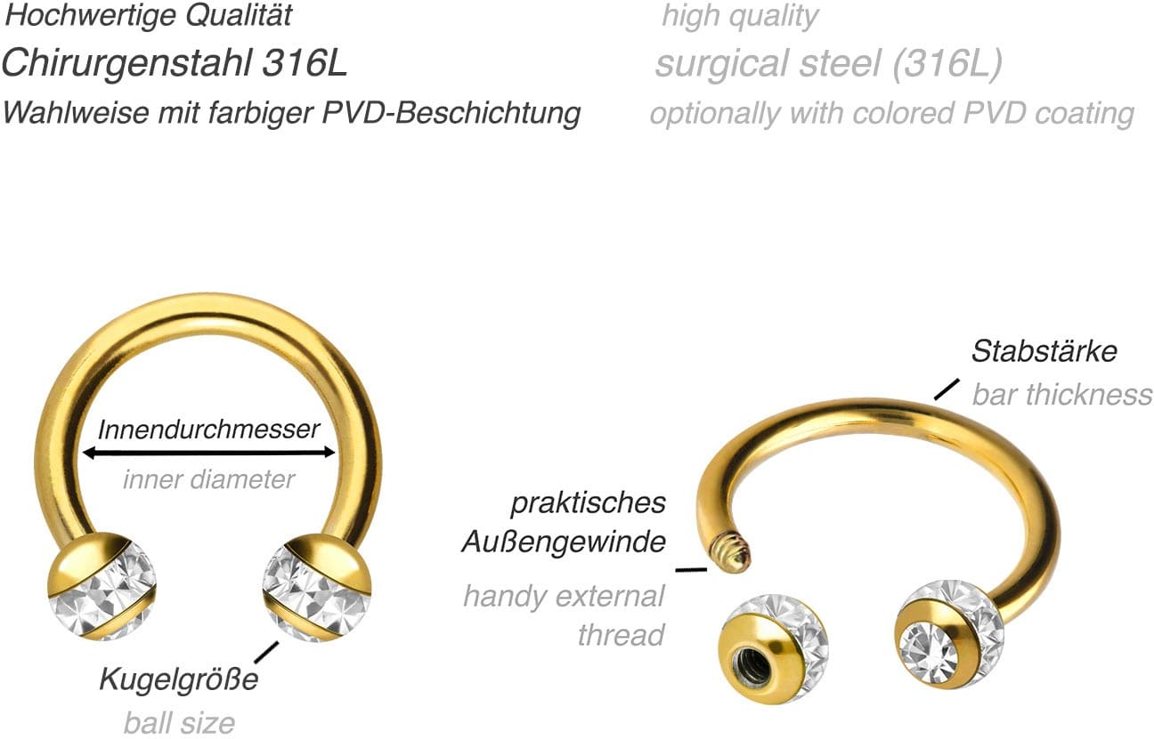 Auffallen war noch nie so einfach! Dieser Hufeisenring aus hautverträglichem Chirurgenstahl 316L ist dein neues Lieblings-Piercing. Mit zwei funkelnden Epoxy-Kugeln, die sich einfach austauschen lassen. Perfekt für Septum, Lippe, Ohr, Tragus, Helix und viele mehr. Mit 1,2mm Stabstärke, 10mm Innendurchmesser und 3mm Kugeln ist er angenehm zu tragen. Die praktische Schraubfunktion macht das An- und Ablegen zum Kinderspiel. Entspricht den EU DIN-Normen für maximale Sicherheit. Ob als Statement-Piece oder dezenter Begleiter - dieser Ring setzt Akzente. Einfach einsetzen und strahlen - dein neues Lieblingsaccessoire wartet!