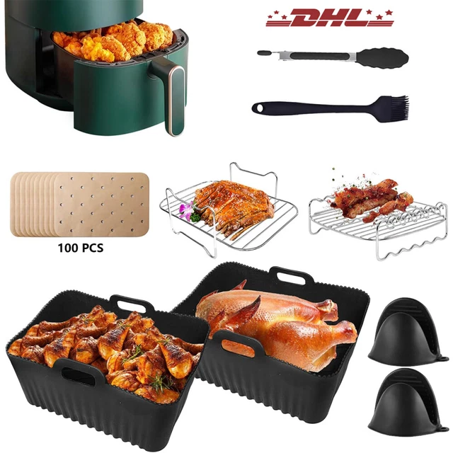 Mach aus deiner Heißluftfritteuse eine echte Küchenwunderwaffe! Dieses 10-teilige Zubehör-Set von Hunnycook ist perfekt für Ninja Foodi AF300EU und AF400EU Modelle (7,6L-9,5L). Enthalten sind: 2 Silikonformen, 1 Rost, 1 Spießhalter mit 4 Spießen, 1 Ölbürste und 1 Zange. Alles aus lebensmittelechten Materialien - die Silikonformen sind hitzebeständig und die Edelstahlteile spülmaschinenfest. Der Rost und Spießhalter optimieren den Luftstrom, sodass du das Essen nicht mehr wenden musst. Die Silikonformen mit Griffen verhindern Verbrennungen. So kannst du mehrere Gerichte gleichzeitig zubereiten und die Kapazität deiner Fritteuse verdoppeln! Perfekt für Familien oder wenn du Gäste bewirtest. Einfach zu reinigen und wiederverwendbar - besser als Einweg-Papiereinlagen. Hol dir dieses Set und entdecke die vielfältigen Möglichkeiten deiner Heißluftfritteuse neu!