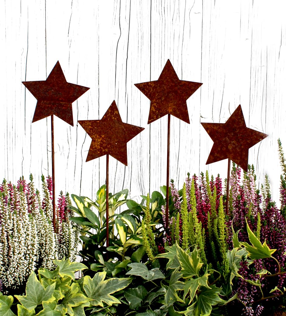 Rost-Charm für deinen Garten! Dieses 4er-Set mit rostigen Metallsternen verleiht deiner Winterdekoration sofort gemütlichen Industrie-Flair. Jeder Stern misst 25x10,5 cm - zwei mit filigranen Durchbrüchen, zwei massiv. Aus hochwertigem Eisen mit spezieller Rost-Oberfläche, die extra so behandelt ist, dass der Look erhalten bleibt. Einfach in Beete, Blumentöpfe oder den Rasen stecken und schon wirkt dein Garten wie verzaubert! Perfekt kombiniert mit Lichterketten, Tannengrün oder alleine als Hingucker. Wetterfest und für draußen geeignet - hält auch frostigen Temperaturen stand. Nicht nur für Weihnachten super, sondern das ganze Jahr über eine tolle Deko! Einfach aufstellen oder mit kleinen Steinen zusätzlich fixieren. Sieht an der Haustür, auf der Fensterbank oder als Tischdekoration mit Kerzen einfach klasse aus! Mach dein Zuhause in dieser Saison besonders gemütlich mit diesen einzigartigen Rost-Sternen.