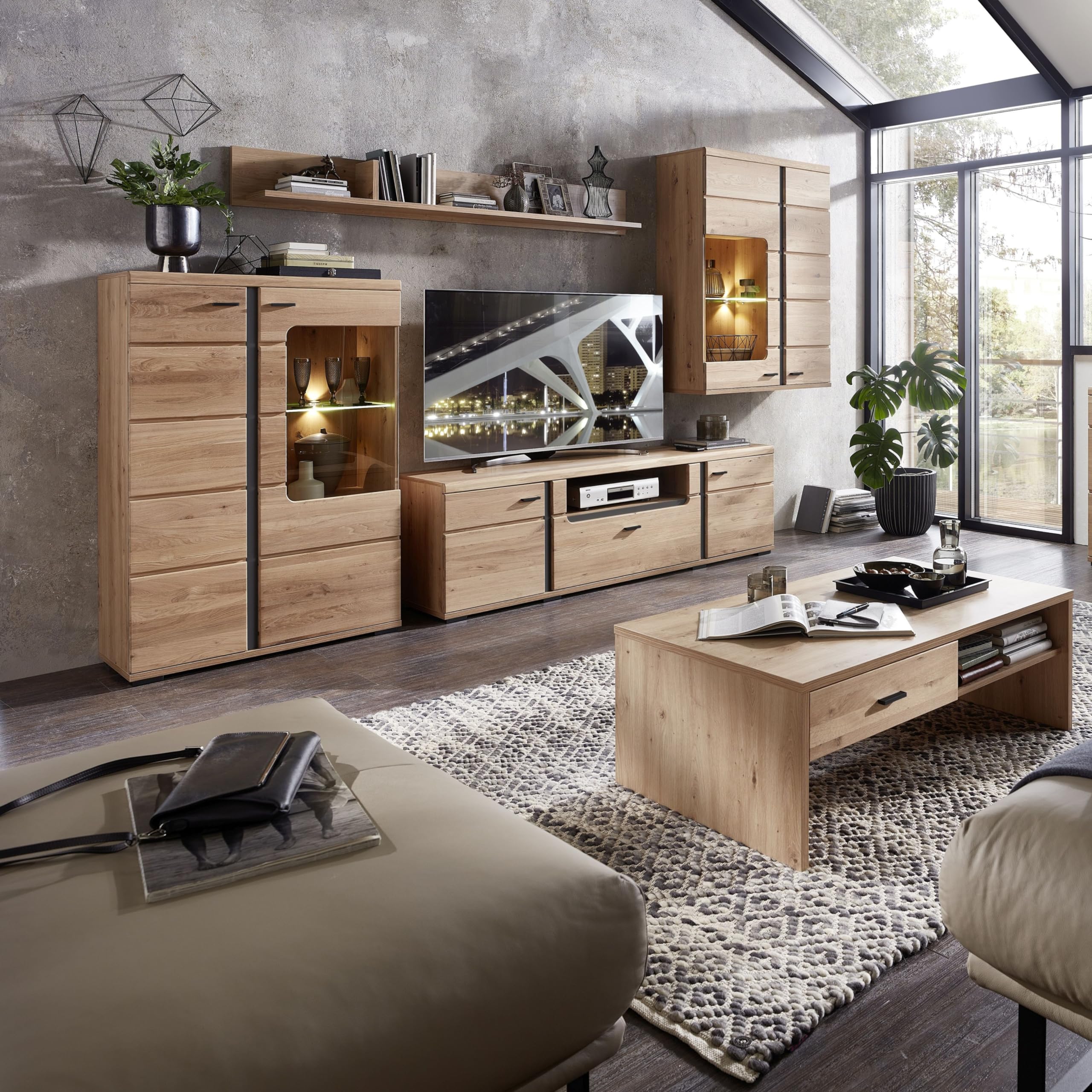 Boah, diese Hängevitrine ist ja der Hammer! Die Kombi aus Kaschmir (matte Optik) und Riva Eiche sieht einfach mega edel aus. Mit 40x124x36cm passt sie super an die Wand und bietet trotzdem ordentlich Stauraum. Das Besondere: Integrierte LED-Beleuchtung! Damit sehen deine Lieblingsstücke - ob Vasen, Bücher oder Erinnerungen - gleich viel besser aus. Die Tür schließt gedämpft, kein lautes Zuknallen. Und du kannst sie links oder rechts anschlagen, total flexibel. Aus FSC-zertifiziertem Holz, also nachhaltig produziert. Der schwarze Metallgriff setzt einen coolen Akzent. Aufbau? Kein Problem, mit der Anleitung geht's fix. Perfekt fürs Wohnzimmer, Flur oder Schlafzimmer. Sieht alleine gut aus, aber passt auch zur ganzen INA-Serie. Stell dir vor: Abends das LED-Licht anmachen und deine Schätze in perfektem Licht präsentieren. Ein echter Hingucker, der nicht nur praktisch ist, sondern deine Einrichtung sofort aufwertet!