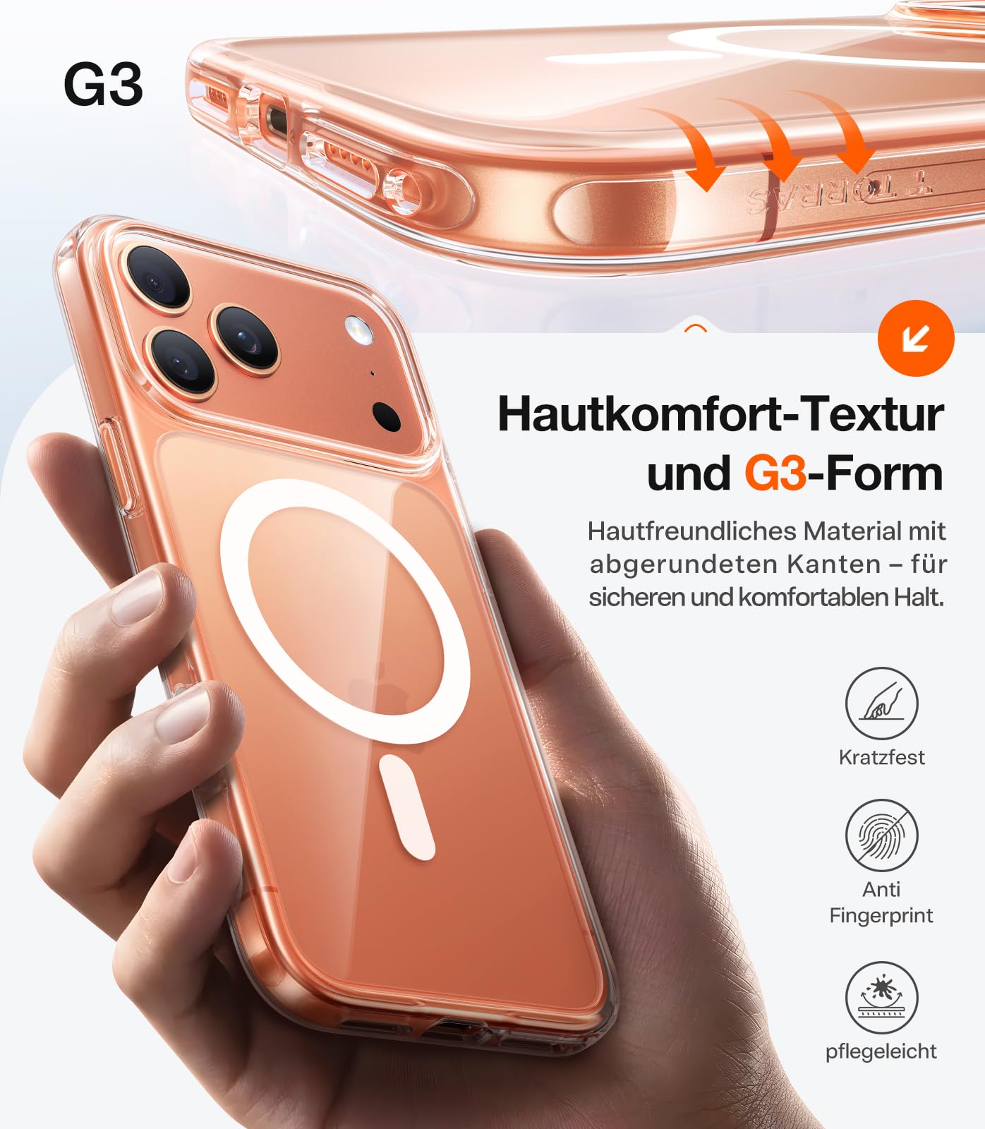 Dein iPhone 17 verdient den besten Schutz! Die TORRAS Guardian-Mag Hülle ist mit über 11 Millionen Verkäufen weltweit der absolute Testsieger. Mit zertifiziertem Militärschutz - hält Stürze aus bis zu 4 Metern Höhe aus! Die N52 Seltenerd-Magnete haben 18N Haftkraft - stärker als das Original. Perfekt kompatibel mit allen MagSafe Ladegeräten und Halterungen. Nur 1,1mm dünn aber mega robust. Erhöhter Kamera- und Display-Schutz sorgt für 360° Sicherheit. Die matte Oberfläche liegt super in der Hand und fingert nicht. Mit verbesserten Metall-Tasten die perfekt reagieren. Dein iPhone ist damit bestens geschützt, sieht dabei aber noch schick aus. Mit 2 Jahren Garantie - da kannst du beruhigt sein!