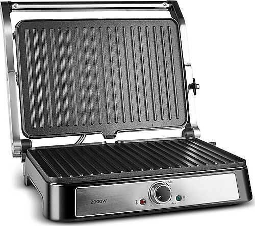 Die antihaftbeschichteten Gusseisenplatten sorgen für leichtes Ablösen und einfache Reinigung. Die integrierte Fettauffangschale hält deine Küche sauber.
