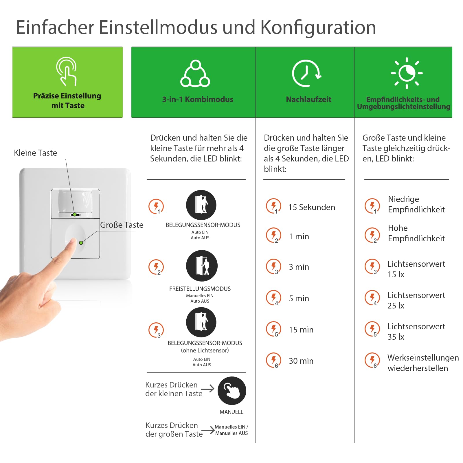 Licht an, ohne den Schalter zu betätigen! Dieser clevere Bewegungsmelder von SENSKY macht's möglich. Mit der praktischen 2-Draht Installation sparst du dir die aufwändige Verkabelung - super einfach anzuschließen. Perfekt für Flur, Treppenhaus oder Lagerräume.\\n\\nDrei Arbeitsmodi geben dir maximale Flexibilität: Belegungssensor für dauerhafte Beleuchtung, Freistellungssensor für automatisches Ein-/Ausschalten, oder einfach manuell per Tastendruck. Alles ohne die Abdeckung abnehmen zu müssen!\\n\\nDer integrierte Dämmerungssensor mit einstellbarer Helligkeit (15lx, 25lx, 35lx) sorgt dafür, dass das Licht nur bei Bedarf angeht. So sparst du Energie ohne Komfortverlust. Verzögerungszeit und Empfindlichkeit sind ebenfalls anpassbar.\\n\\nWichtig: Funktioniert nur mit Glühbirnen, Halogen- und LED-Lampen ab 3W. Für Leuchtstofflampen oder Ventilatoren nicht geeignet. Kein Nullleiter nötig, nur für Innenräume. Mit 1 Jahr Garantie - da kannst du beruhigt zugreifen!