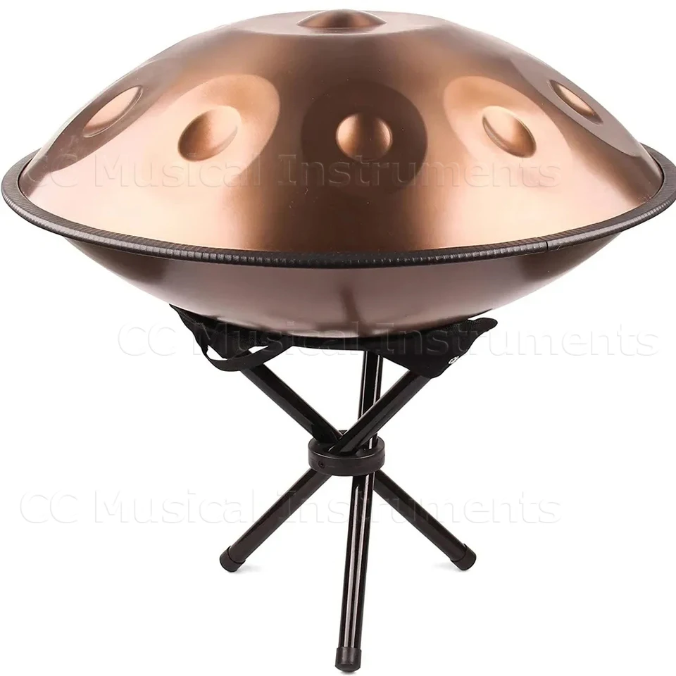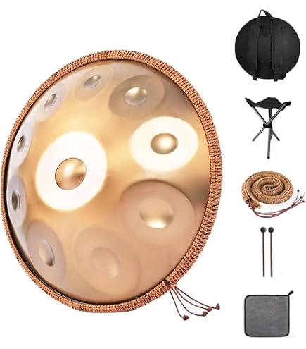 Träumst du von meditativen Klängen? Diese wunderschöne Derlvbak Handpan in Gold wird dich verzaubern! Mit 22 Zoll Durchmesser und 12 harmonischen Tönen (D3-D5-F5/A3/bB3/D4/F4/A4/G4/E4/C4/C5) erzeugst du ätherische, tiefe Klänge die lange nachhallen. Aus 1,2mm Nitridstahl gefertigt ist sie super robust und rostfrei. Jedes Instrument wird von Profis auf 440Hz gestimmt für perfekte Klangqualität. Perfekt für Meditation, Yoga, Stressabbau oder einfach zum Entspannen nach einem anstrengenden Tag. Im Lieferumfang: Handpan, Trommelstöcke, Handtasche, Ständer und Reinigungstuch - alles was du brauchst! Mit nur 4kg Gewicht ist sie super transportabel. Ob für zu Hause, im Studio oder unterwegs - diese Handpan bringt Frieden und Kreativität in dein Leben. Ein Instrument das nicht nur toll klingt, sondern auch wunderschön aussieht!
