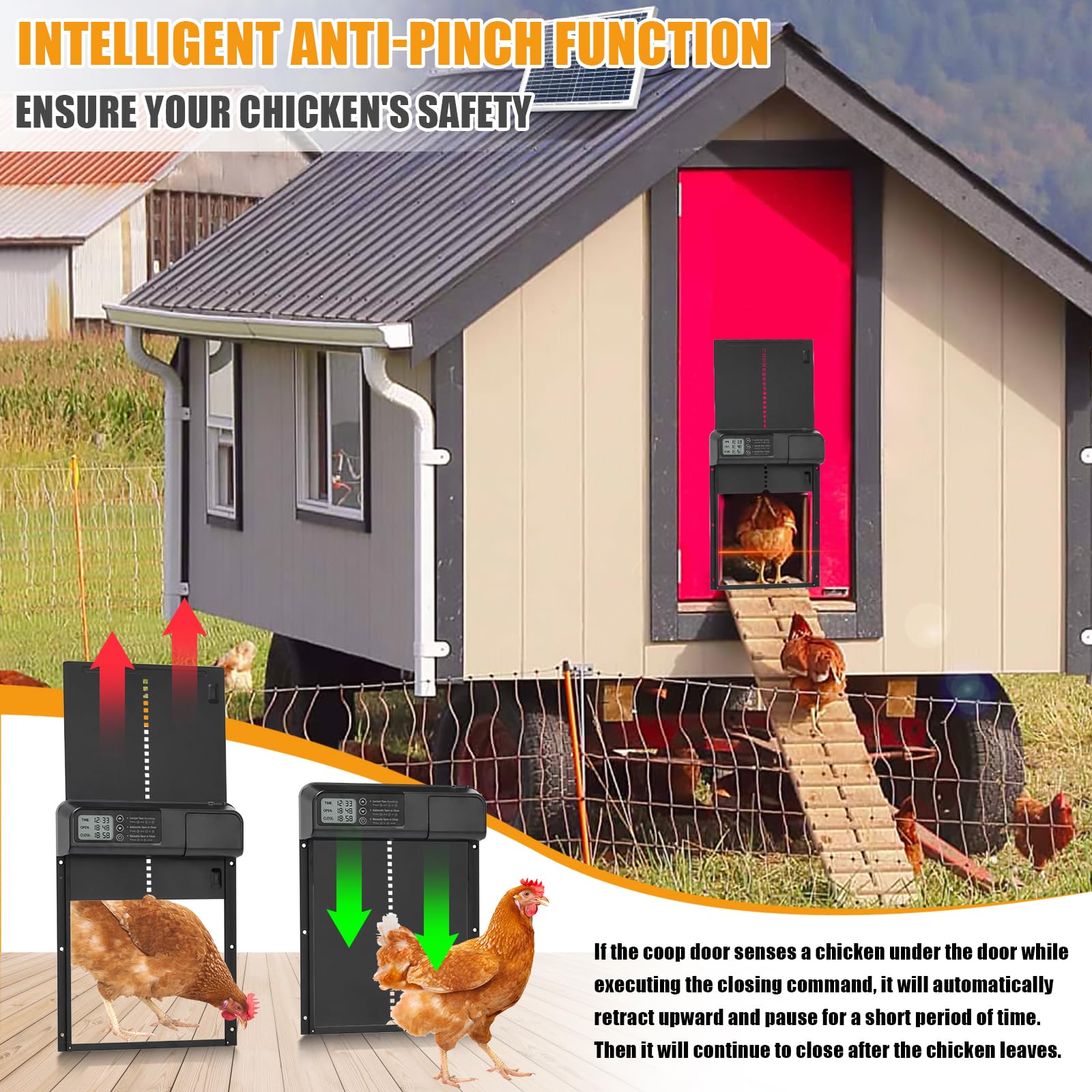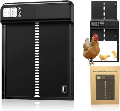 Deine Hühner verdienen das Beste! Diese automatische Hühnerklappe mit Solarantrieb macht dir das Leben leichter. Sie öffnet und schließt sich je nach Timer oder Lichtsensor, sodass deine Hühner immer zur richtigen Zeit rein und raus können. Die Klappe hat ein großes Display und eine einfache Bedienung per Fernbedienung oder Panel. Mit Einklemmschutz – falls was im Weg ist, stoppt sie sofort. Aus Aluminiumlegierung gefertigt, ist sie rostfrei, hitzebeständig und hält jedem Wetter stand. Der Akku lädt per Solarpanel oder USB und hielt bei voller Ladung bis zu zwei Monate. Perfekt auch für Enten- oder Gänseställe. Keine Sorge mehr um Fuchs, Marder oder andere Eindringlinge – deine Tiere sind sicher und du hast mehr Freiheit. Einfach genial für jeden Hühnerhalter!