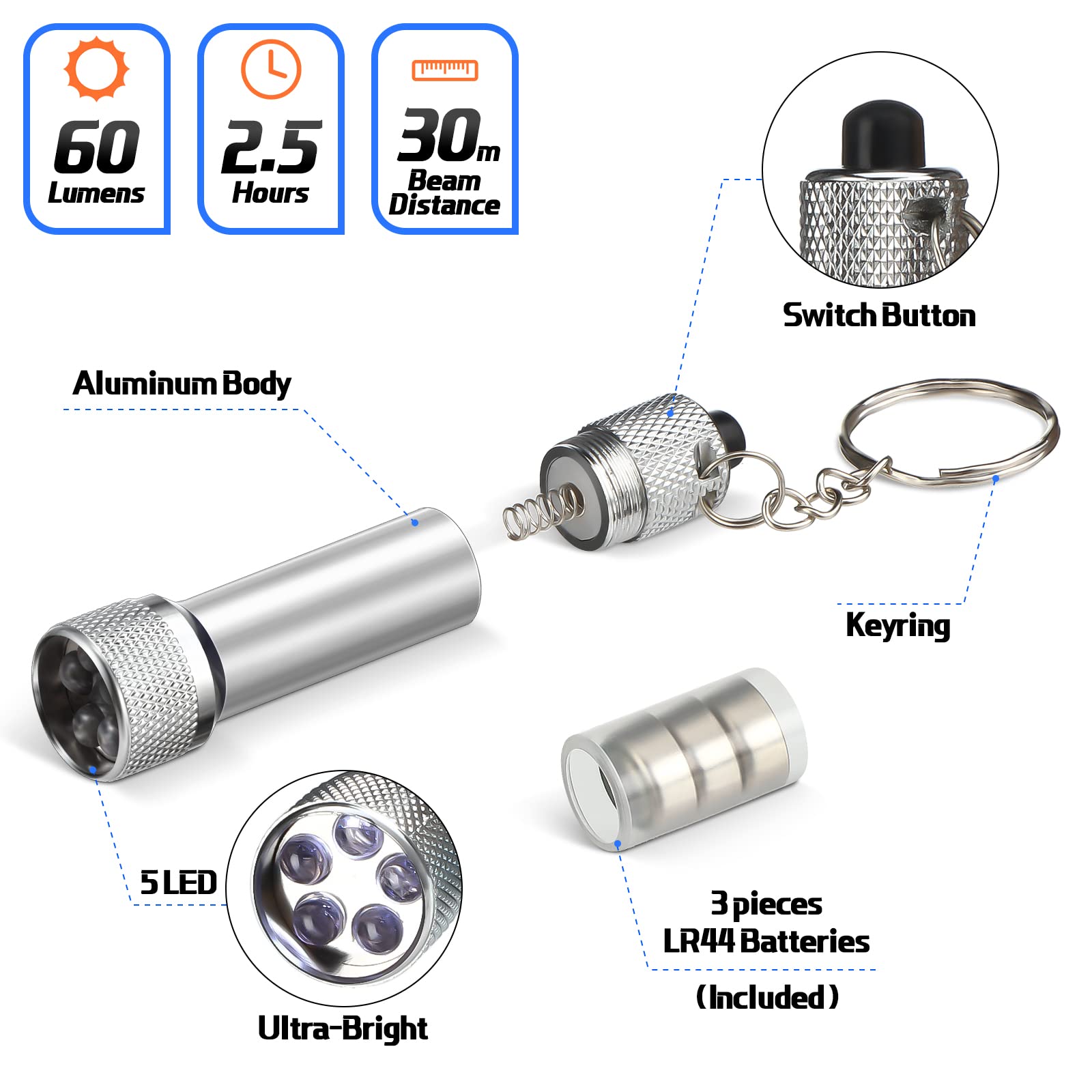 Immer Licht dabei - und zwar fünfmal! Dieses praktische 5er-Set von Ipetboom ist super nützlich für alle möglichen Situationen. Jeder Schlüsselanhänger ist nur 7 x 2,3 x 0,5 cm klein - passt also an jeden Schlüsselbund ohne zu stören. Mit blauem LED-Licht, das schön hell leuchtet. Und wasserdicht sind sie auch noch! Super praktisch wenn du mal im Dunkeln nach deinem Schlüssel suchst oder einfach eine kleine Lichtquelle brauchst. Aus Metall und Kunststoff gefertigt, also robust genug für den Alltag. Perfekt für Camping-Ausflüge, Wanderungen, als Notfalllicht oder sogar als Hunde-Licht für den abendlichen Gassi-Gang. Du kannst sie aber auch an Rucksäcke, Reißverschlüsse oder die Jacke deines Kindes hängen - so wird man im Dunkeln besser gesehen. Einfach zu bedienen, leicht und wirklich praktisch. Mit fünf Stück im Set hast du immer Ersatz oder kannst welche verschenken. Ein richtig nützliches Gadget, das man öfter braucht, als man denkt!