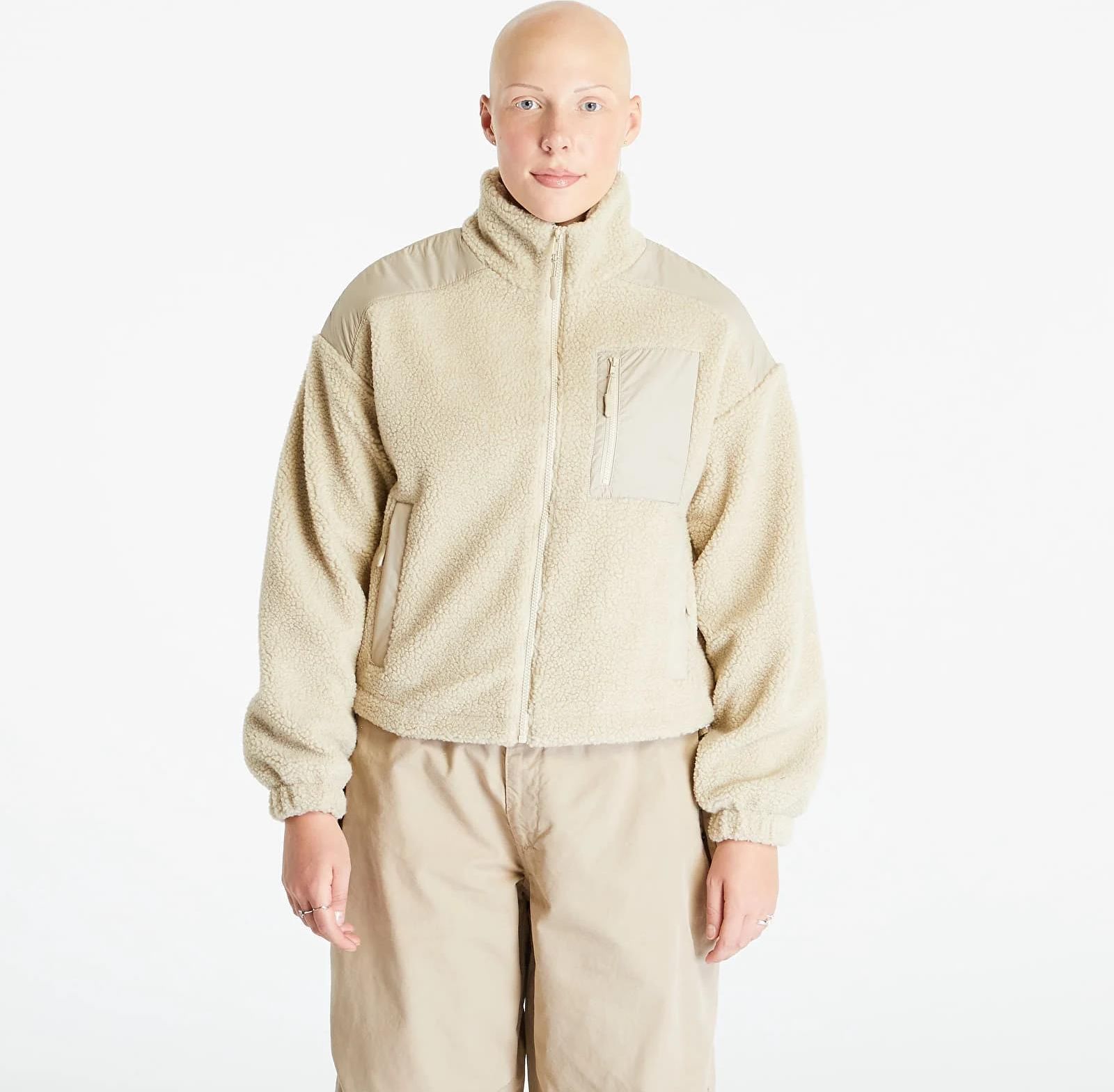 Mädels, diese Sherpa Jacke ist ja mega kuschelig! Flauschiges Material mit coolen Nylon-Einsätzen an Schultern und Brusttasche. Oversize-Schnitt, sitzt lässig und bequem. Mit hohem Stehkragen und Reißverschluss vorne. Seitentaschen sind praktisch, und der Kordelzug im Saum macht ne coole Silhouette. Ärmelbündchen sind elastisch, Mesh-Futter sorgt für gutes Klima. Perfekt für Herbst und Winter - stylisch und warm zugleich. Sieht aus wie ne teure Designerjacke, ist aber echt bezahlbar.