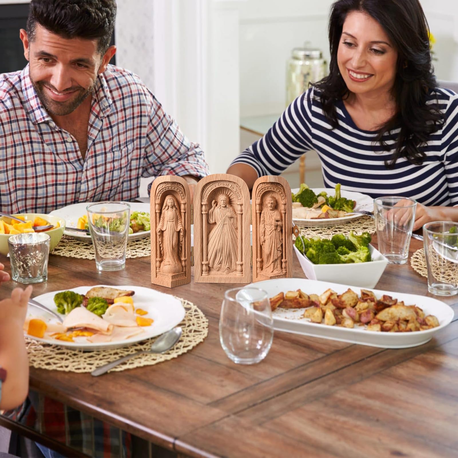 Dieser wunderschöne Reisealtar aus Buchenholz ist etwas ganz Besonderes! Als Triptychon gestaltet zeigt er Jesus, die Jungfrau Maria und Josef - symbolisch für die Heilige Familie. Geschlossen misst er nur 10,5x5,5x5,5cm, ist also perfekt für unterwegs. Handgeschnitzt von erfahrenen Kunsthandwerkern, ein echtes Unikat. Ob für die Reise, als Deko zu Hause oder als besonderes Geschenk zu Weihnachten, Ostern oder Geburtstagen - dieser Altar bringt spirituellen Trost und ist immer ein Blickfang. Einfach aufklappen und sich an der detailreichen Arbeit erfreuen!