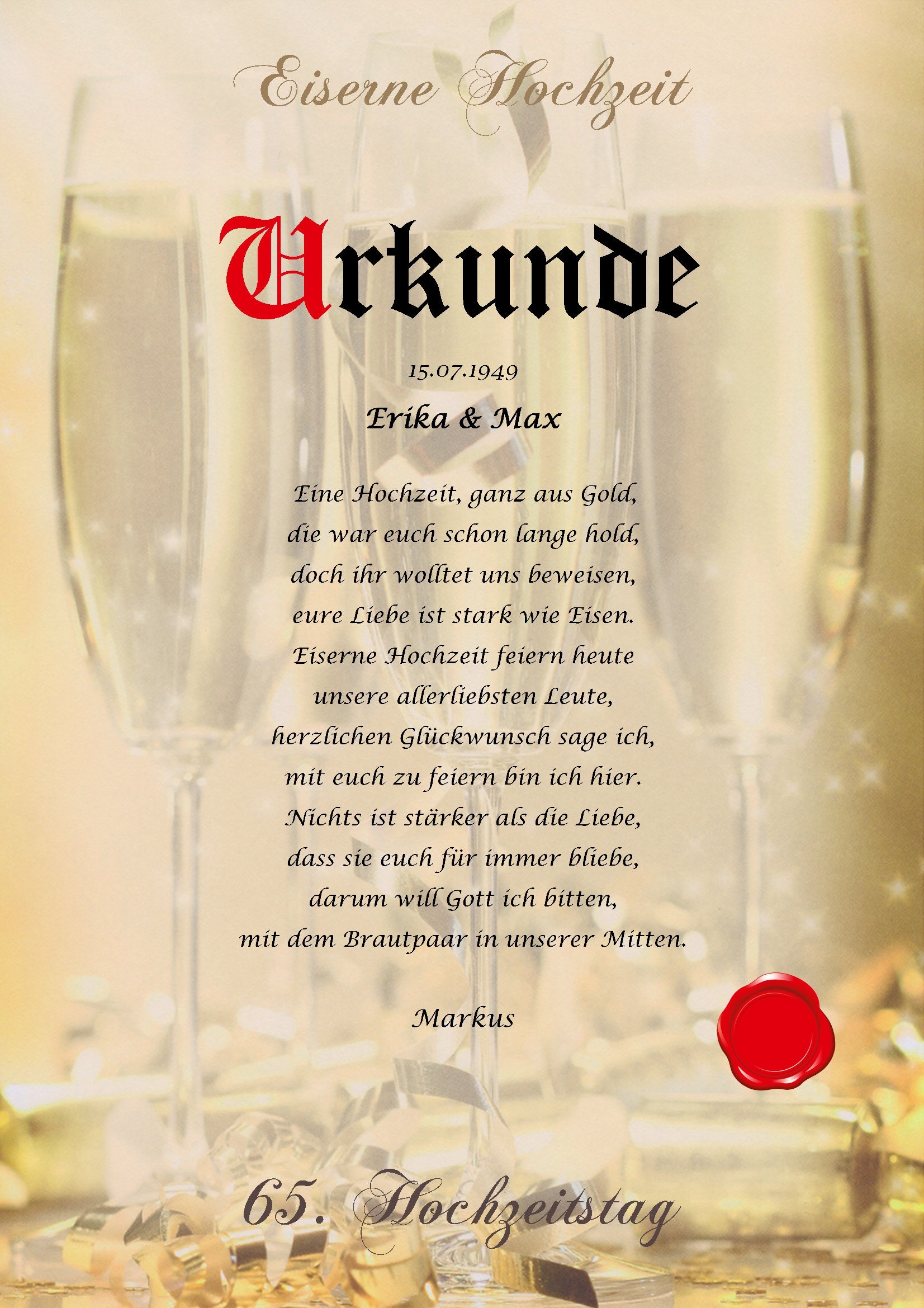 65 Jahre Ehe - das ist einfach unglaublich und verdient eine besondere Würdigung! Diese wunderschöne Urkunde ist viel mehr als nur eine einfache Glückwunschkarte. Sie wird zu einem bleibenden Andenken, das die Jubilare noch lange an diesen besonderen Tag erinnern wird. Im Vergleich zu den oft altmodischen Urkunden, die man sonst so kennt, überzeugt dieses Design durch moderne und zeitlose Optik. Gedruckt auf hochwertigem 300g/m² Strukturkarton im DIN A4 Format - das fühlt sich nicht nur wertig an, sondern sieht auch aus wie gemacht für den Bilderrahmen. Die liebevoll formulierten Sprüche gehen direkt ins Herz und sind ein Markenzeichen dieses kleinen Familienbetriebs aus der Region zwischen Schwarzwald und schwäbischer Alb. Jede Urkunde wird hier mit viel Herzblut in Handarbeit gefertigt - Made in Germany vom Feinsten! Perfekt als Geschenk alleine oder kombiniert mit einem schönen Bilderrahmen. Übrigens: Die auf den Fotos abgebildeten Deko-Artikel wie Bilderrahmen oder Holztabletts sind nicht im Lieferumfang enthalten - es geht wirklich nur um die wunderschöne Urkunde selbst, die aber garantiert für strahlende Augen sorgt!