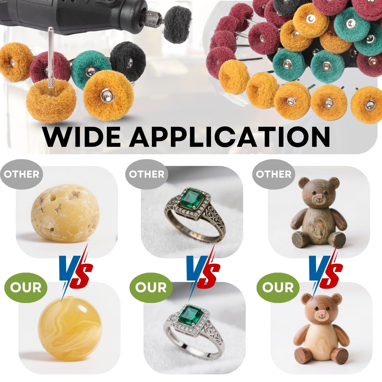 Perfekt für Edelstahl, Aluminium, Kupfer, aber auch für Kunststoffe, Holz, Stein und Beton. Erzeugt gleichmäßige Oberflächen ohne Verfärbungen oder Hitzeschäden. Besonders gut für's Drahtziehen und Polieren von Metalloberflächen.