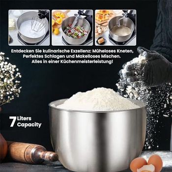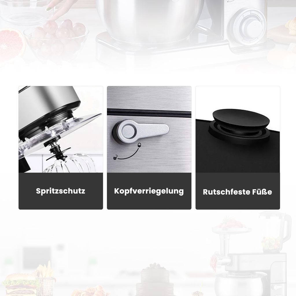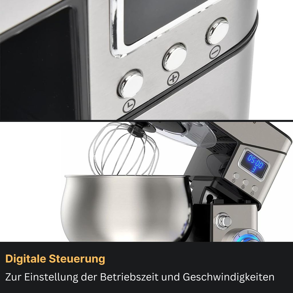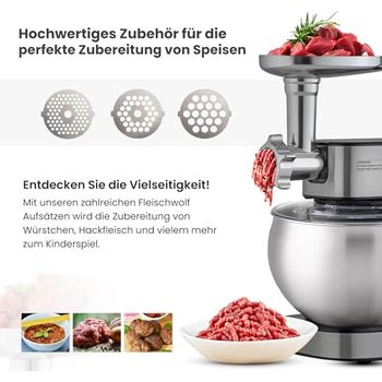 Wow, diese Küchenmaschine ist ein absolutes Kraftpaket! Mit 2000 Watt Motorleistung meistert sie alles - vom Teigkneten über Mixen bis zum Fleischwolf-Einsatz. Die 6-Liter-Edelstahlschüssel ist riesig und perfekt für große Portionen. Das 3-in-1 Design beinhaltet einen Fleischwolf, ein Nudelset mit 6 Aufsätzen, Kibbe-Aufsatz und Wurstfüller - da kannst du dich so richtig austoben! Der 1,5-Liter-Glasmixer ist GS-zertifiziert und absolut sicher in der Anwendung. 6 Geschwindigkeitsstufen plus Pulsfunktion geben dir die volle Kontrolle über jede Zubereitung. Antirutschfüße sorgen für stabilen Stand, der Spritzschutz verhindert lästiges Kleckern. Alles aus hochwertigem Edelstahl und Glas - leicht zu reinigen und geschmacksneutral. Ob für Brotteig, Smoothies, Hackfleisch oder hausgemachte Nudeln - diese Maschine wird dein neuer bester Freund in der Küche! Einfach die Zubehörteile wechseln und loslegen - kochen war noch nie so einfach!