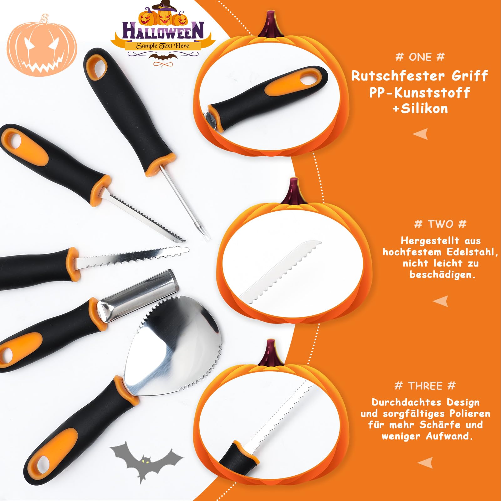Perfekt für gruselige Halloween-Kürbisse! Dieses UDIKEFO Schnitzset hat alles, was du für coole Kürbis-Gesichter brauchst. Mit 7 verschiedenen Werkzeugen aus Edelstahl und 6 praktischen PVC-Vorlagen wird das Schnitzen zum Kinderspiel.\\n\\n• 7 Schnitzwerkzeuge aus Edelstahl\\n• 6 PVC-Schnitzvorlagen mit verschiedenen Motiven\\n• Material: Edelstahl & Polypropylen\\n• Rutschfeste Griffe für sichere Handhabung\\n• Auch für Wassermelonen und andere Früchte geeignet\\n• Inklusive praktischer Aufbewahrungstasche\\n\\nEgal ob gruselige Fratzen, süße Gesichter oder kreative Muster - mit diesem Set kannst du deine Kürbisse in echte Kunstwerke verwandeln. Super für Familien, Kinder und alle, die Halloween lieben. Einfach Vorlage aussuchen, Kürbis schnitzen und staunen!