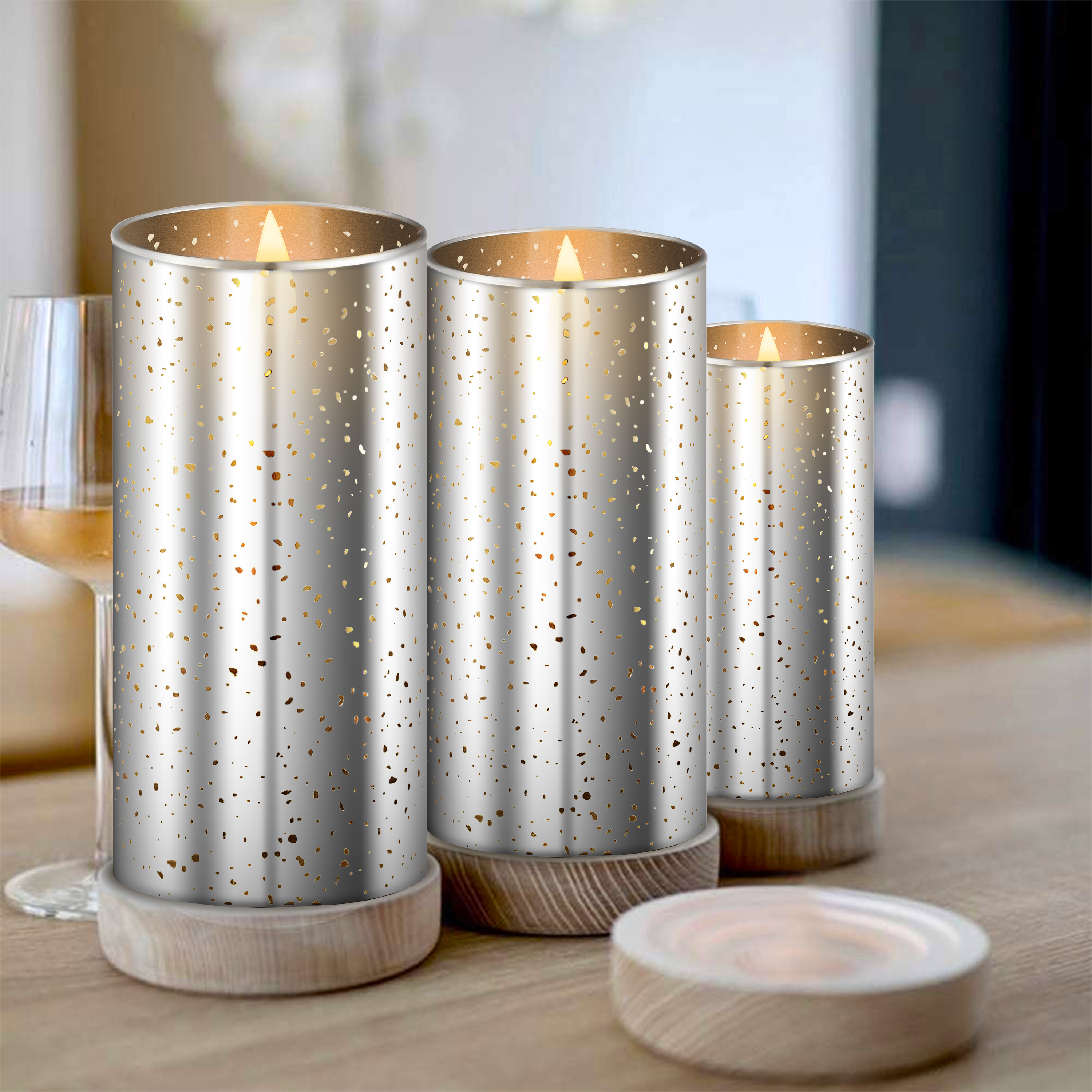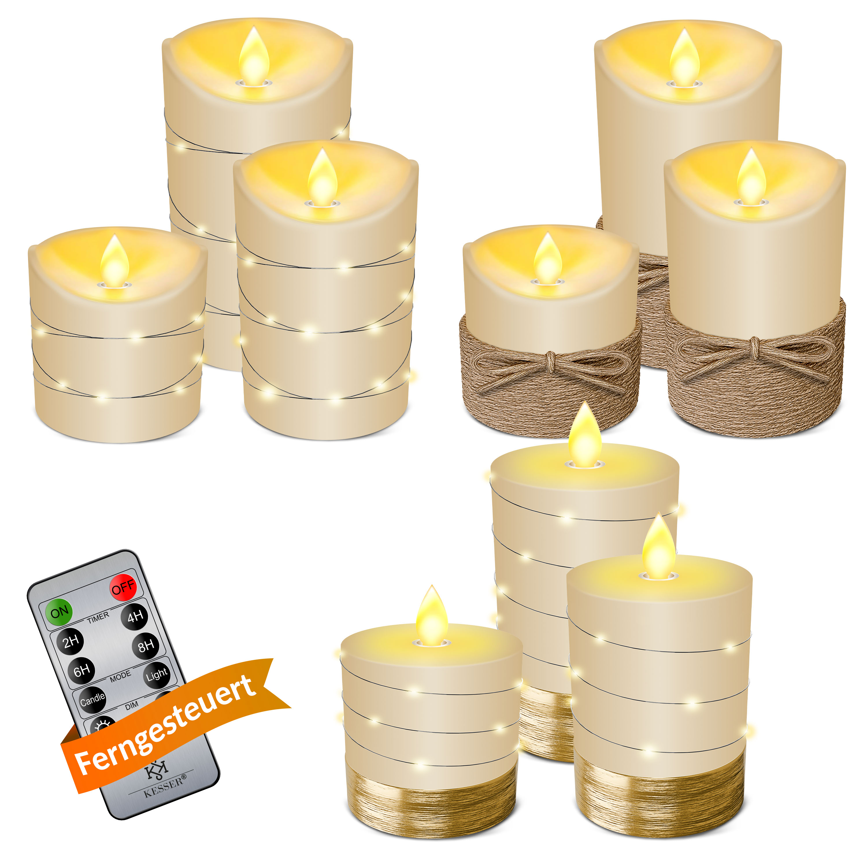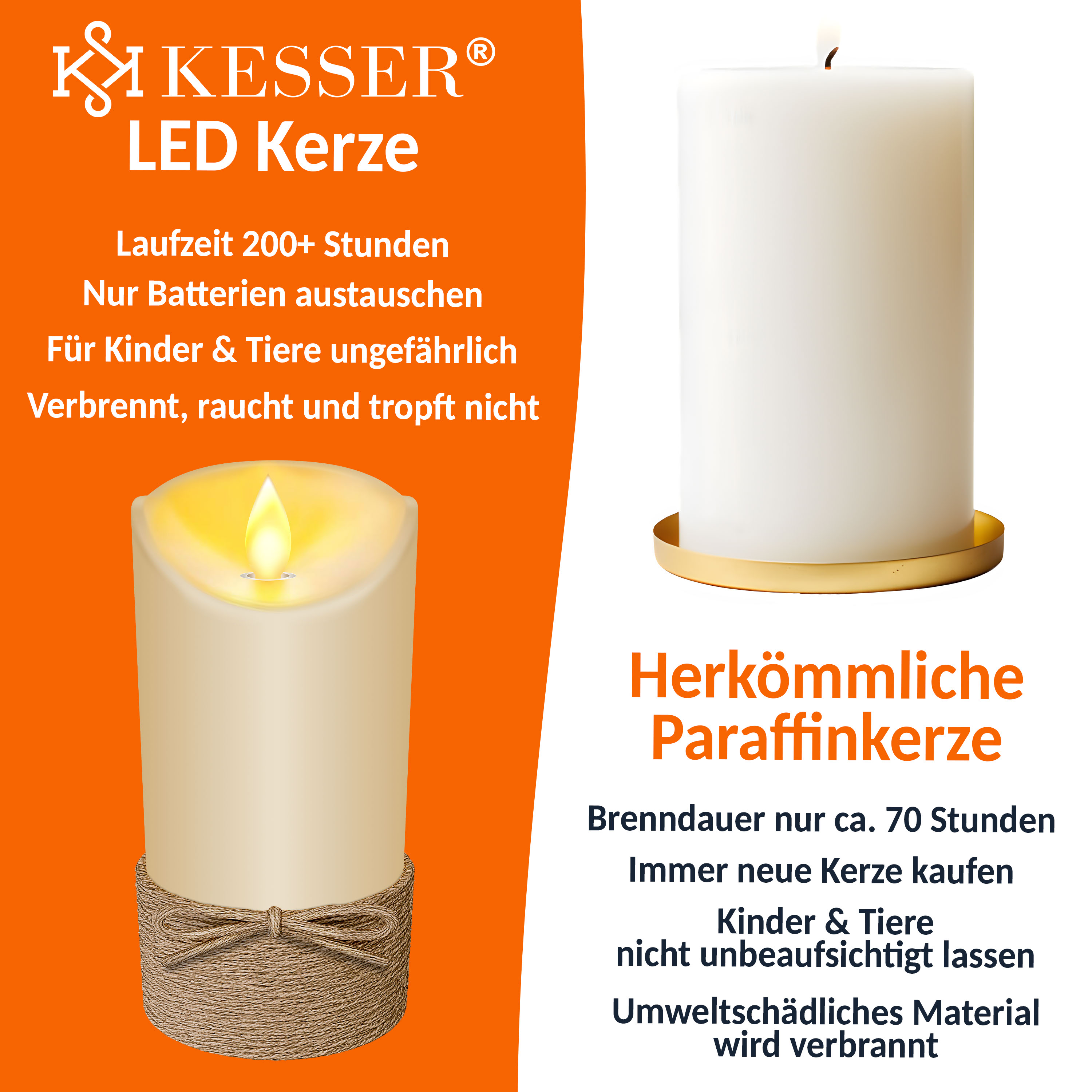 Gemütliche Atmosphäre ohne die Gefahr von offenem Feuer! Diese LED-Kerzen von KESSER sehen aus wie echt - inklusive Echtwachs-Füllung! Im 3er-Set mit verschiedenen Höhen (10cm, 12,5cm, 15cm) für abwechslungsreiche Arrangements. Das Flackerlicht ist täuschend echt und sorgt für diese wunderbar gemütliche Stimmung. Mit praktischem Timer: 2, 4, 6 oder 8 Stunden Laufzeit, dann schalten sie sich automatisch ab. Auch dimmbar für die perfekte Helligkeit. Kein lästiges Wachs wegkratzen, keine Rußentwicklung, absolut sicher auch mit Kindern und Haustieren! Laufzeit bis zu 200 Stunden - das ist echt lange! Benötigt 3 AA Batterien (nicht im Lieferumfang). Perfekt für Wohnzimmer, Restaurant, oder auch draußen auf der Terrasse. Einfach einschalten und entspannen!